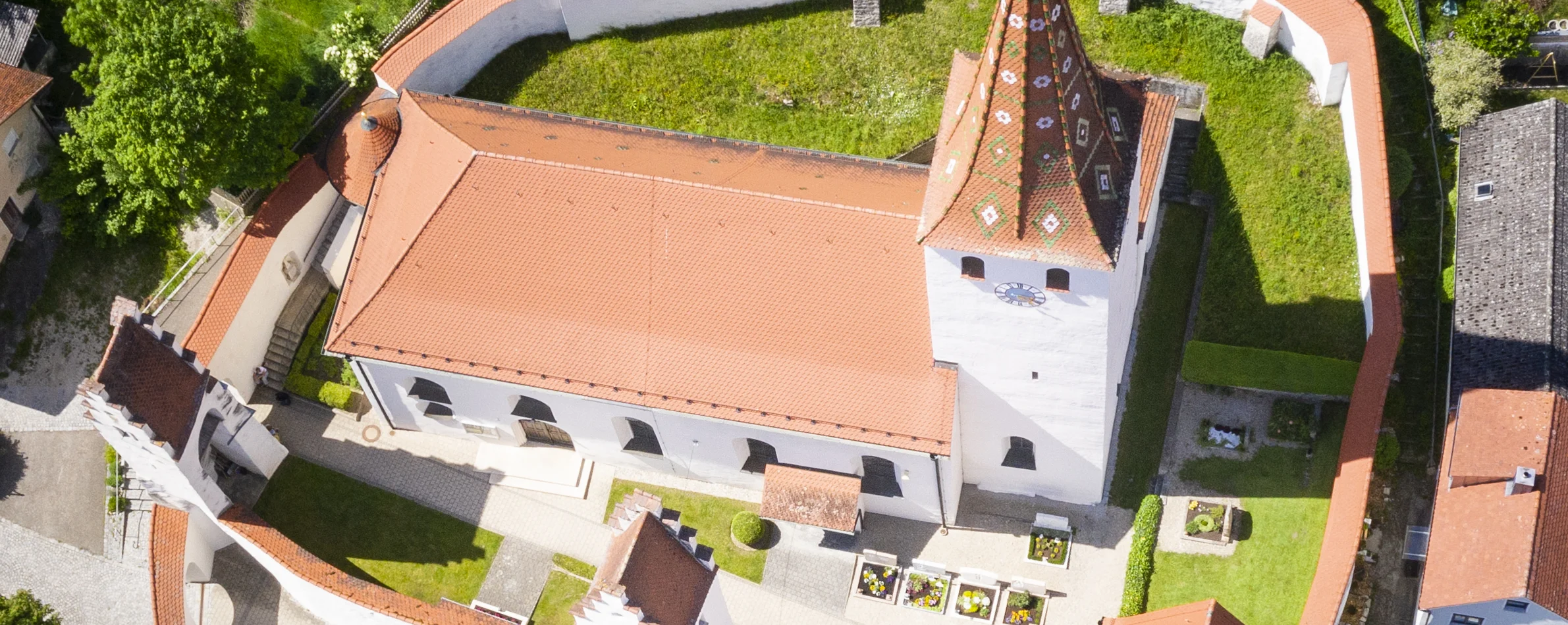 Marktplatz GredingWagnerei-Museum in Dietfurt an der AltmühlStadtansicht mit roten Ziegeldächern, Kirchturm und rundem Steinturm unter blauem Himmel mit Wolken.Brunnen mit Puttenfiguren im Vordergrund und historische Gebäude mit roten Dächern im Hintergrund, zwei Personen gehen.