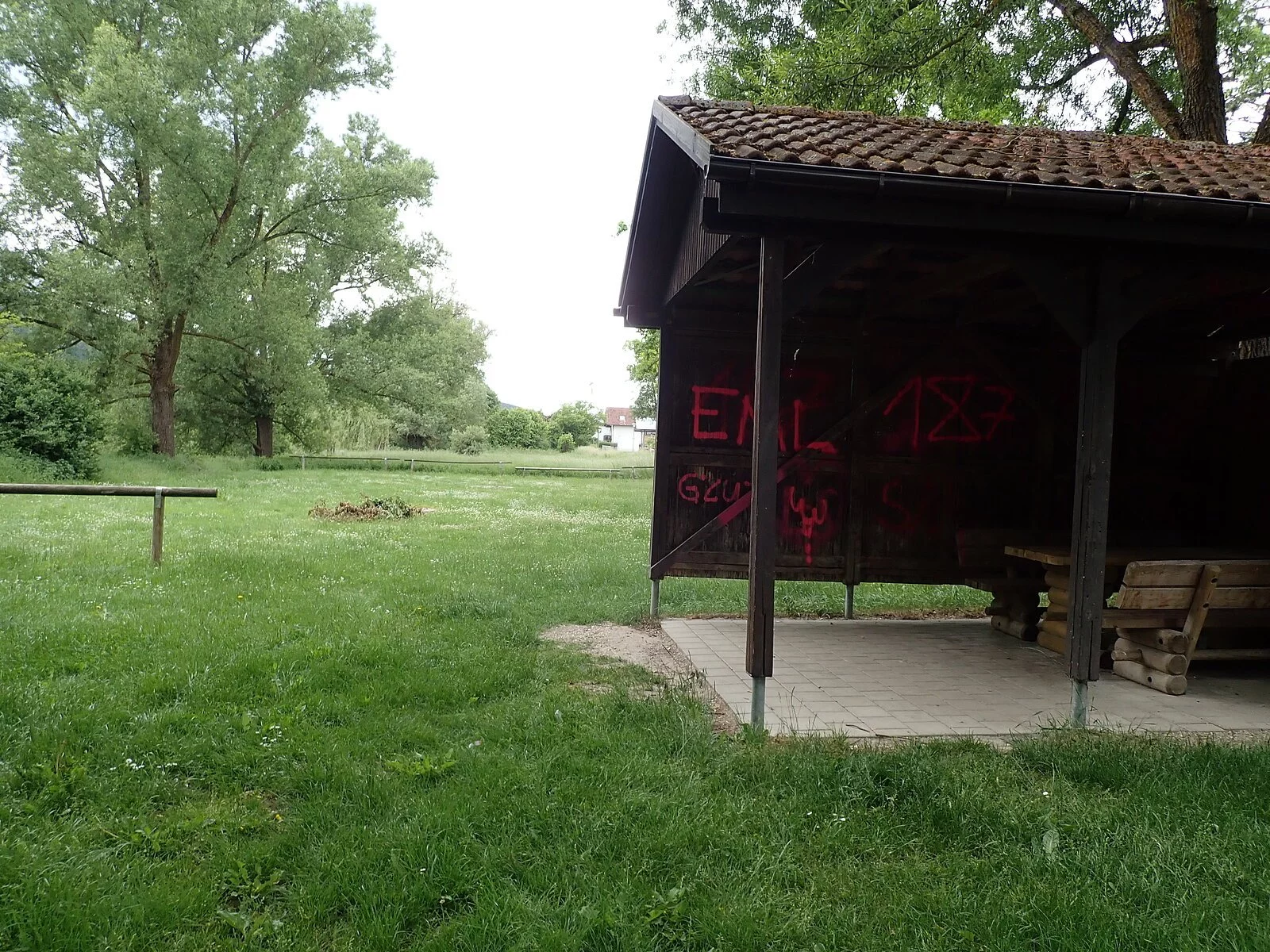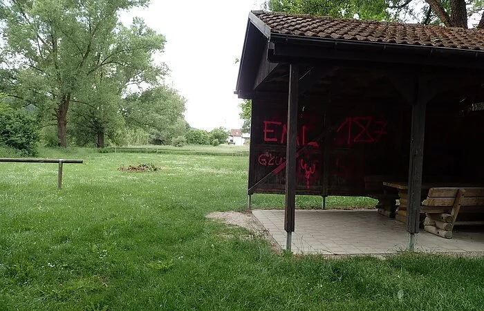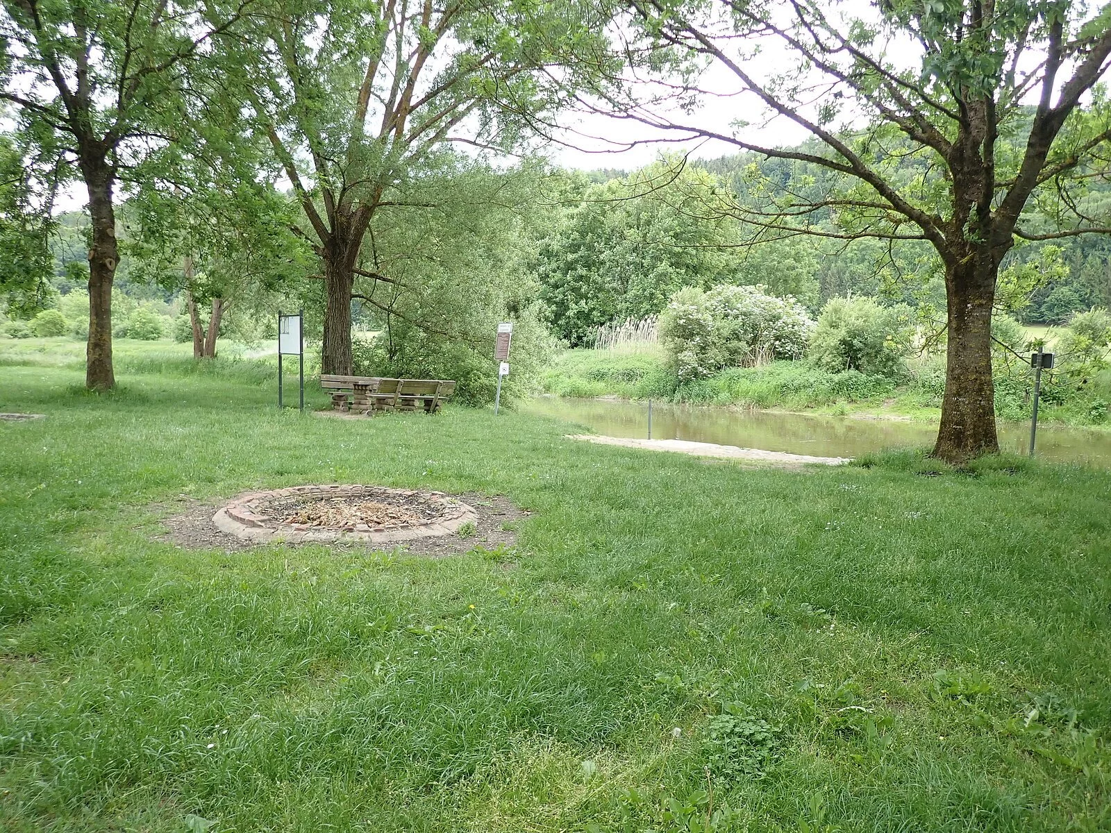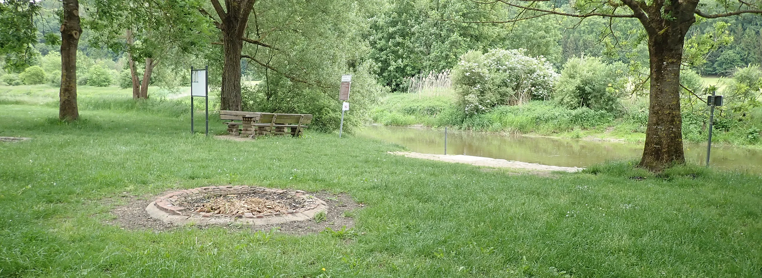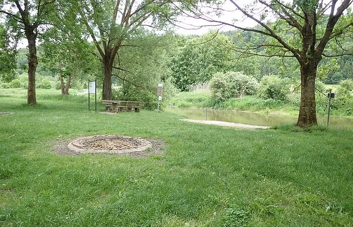 Der Bootsrastplatz direkt an der Altmühl ist eine grüne Wiese mit einigen Bäumen als Schattenspender. Es gibt einige Feuerstellen und Sitzgelegenheiten.Eine Schutzhütte aus Holz mit Dach und einem befestigten Boden schützen die Bootswanderer bei Regen vor der Nässe.