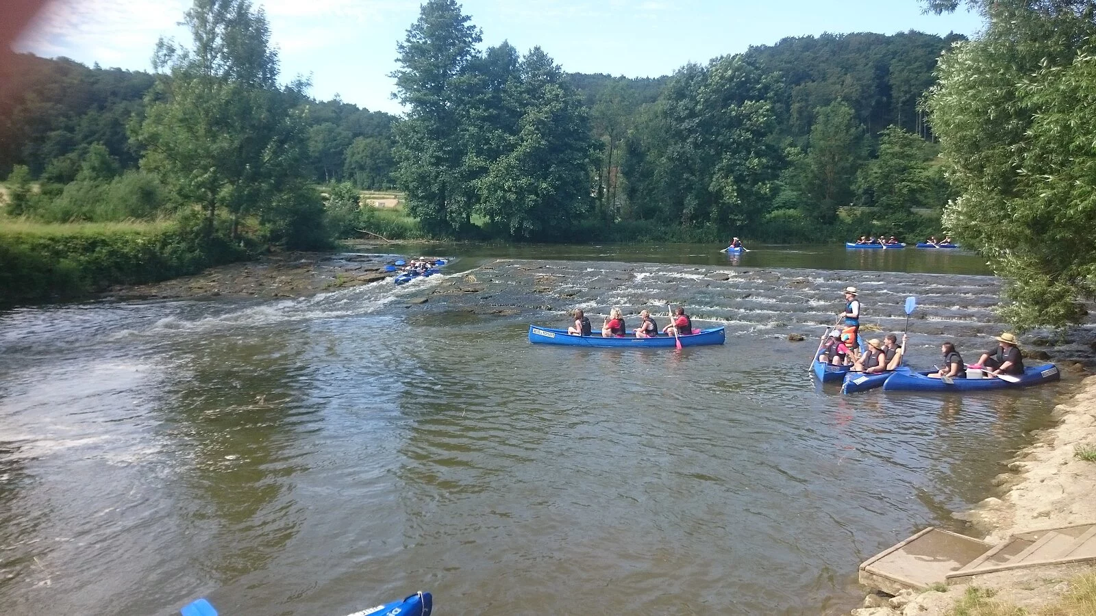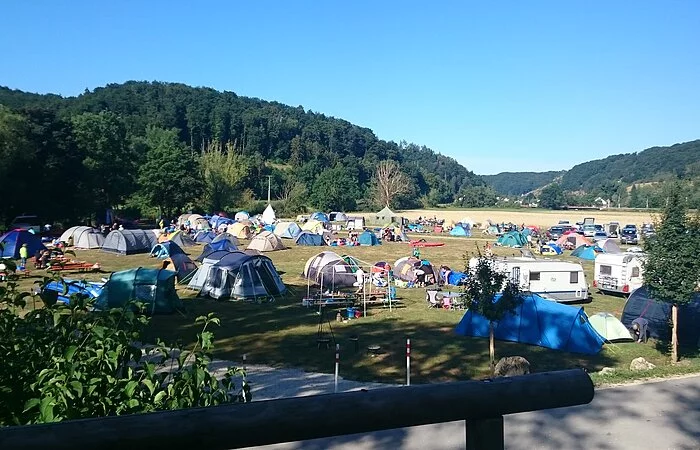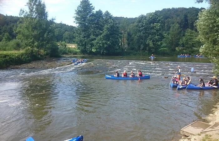 Bootsverleih dirkt am Platz. Vom nahegelegenen Panoramawanderweg können Sie auf die "Bootsrutsche" der Altmühl herunterblicken.