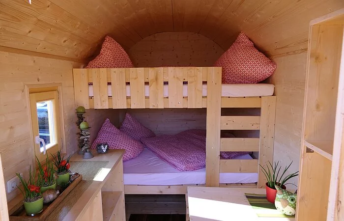 Zwei Erwachsene und bis zu drei Kinder können in einem der aus Naturmaterialen gefertigten Schäferwagen übernachten, die jeweils mit zwei Doppelbetten als Stockbett, Sitzecke, Schrank sowie Kühlschrank ausgestattet sind. Die kleine Terrasse verleiht einen urig gemütlichen Eindruck und lädt zum geselligen Zusammensitzen ein. Für gemeinsames Beisammensein stehen Grillplätze zur Verfügung.