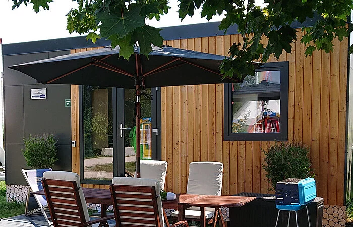 Moderne Holzhütte mit Terrasse, Tisch, Stühlen und Sonnenschirm im Freien, umgeben von Bäumen.Kleine Küche mit Holzschränken, Elektrogeräten, Spüle und Esstisch. Fenster mit Blick ins Freie.