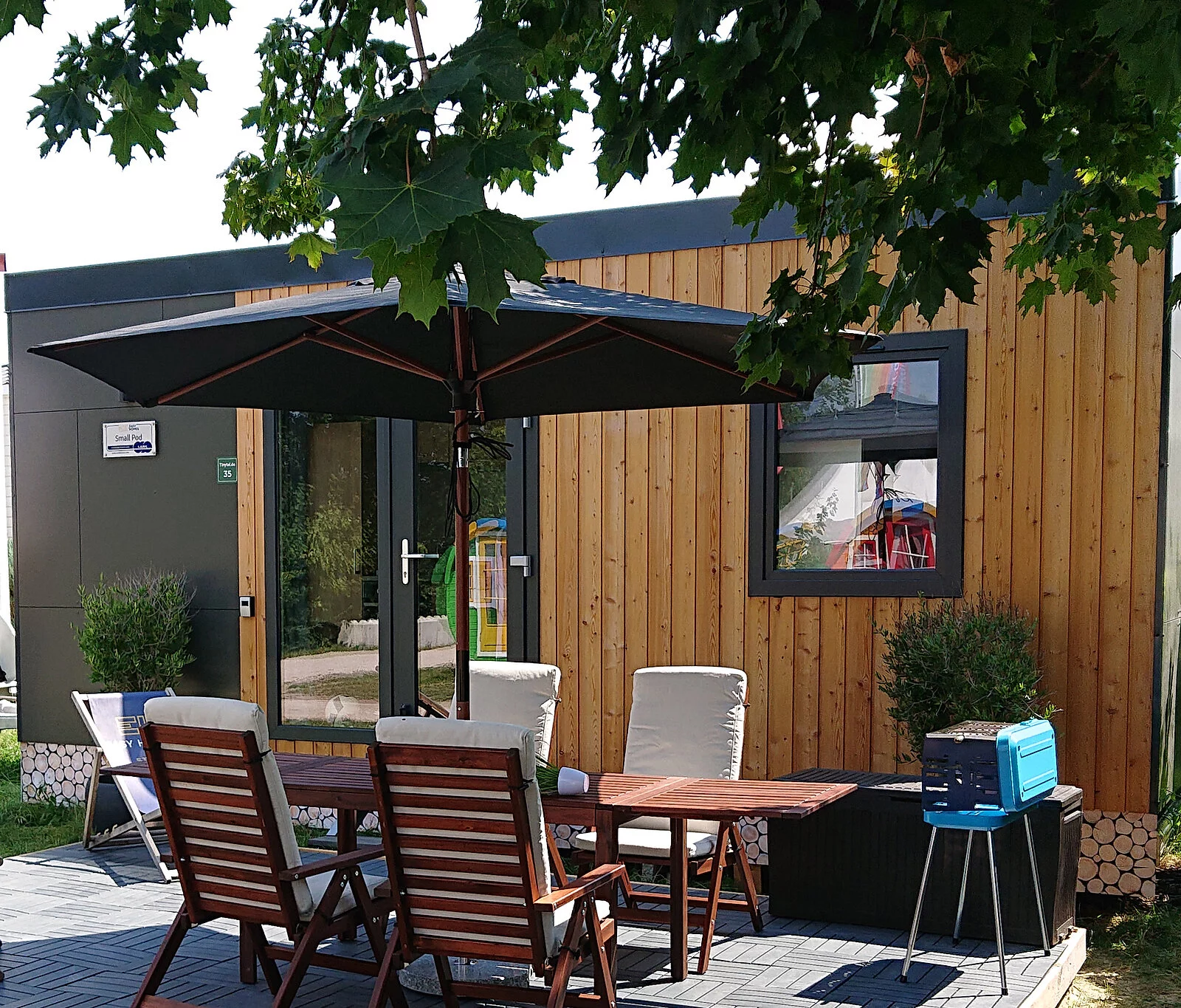 Übernachten Sie in einem unserer winzigen Häuser und genießen Sie das Wohnen auf kleinem Raum. Die Tiny Häuser bieten mit Küchenzeile (Kühlschrank, Kochfeld), Wohnbereich mit Schlafcouch und Essplatz, TV, Bad (Dusche, WC), einem räumlich abgetrennten Schlafbereich sowie Einbauschrankwand und zusätzlichem Stauraum genügend Platz für einen entspannten Aufenthalt.