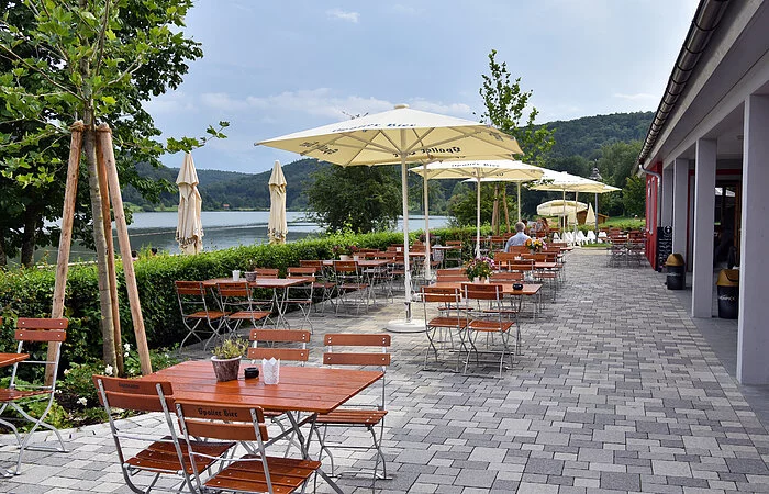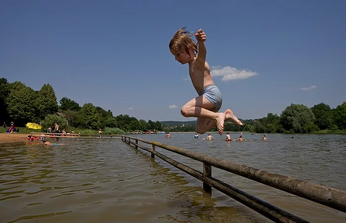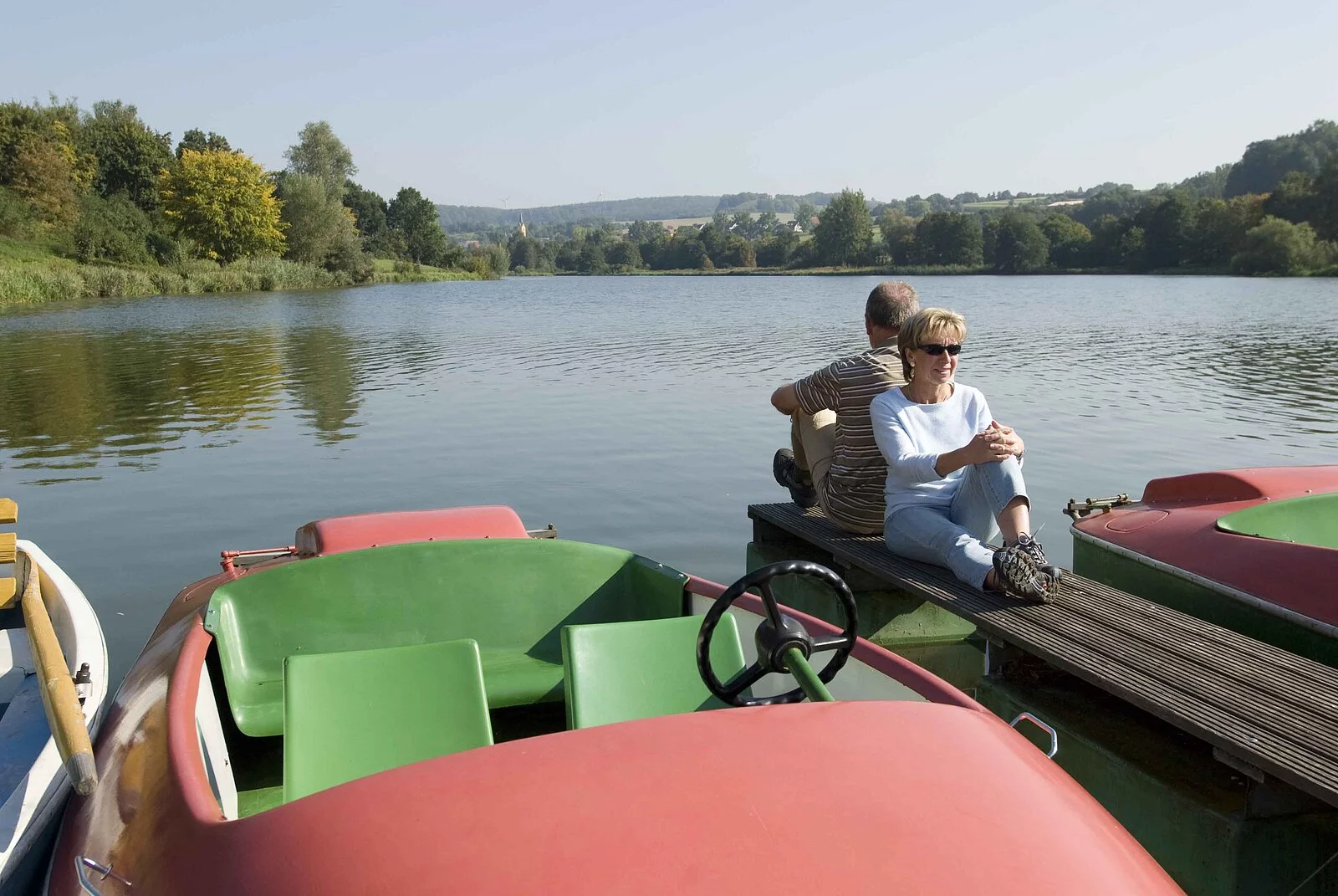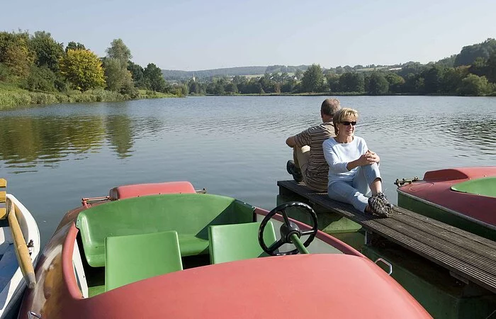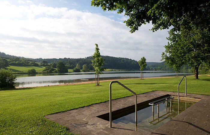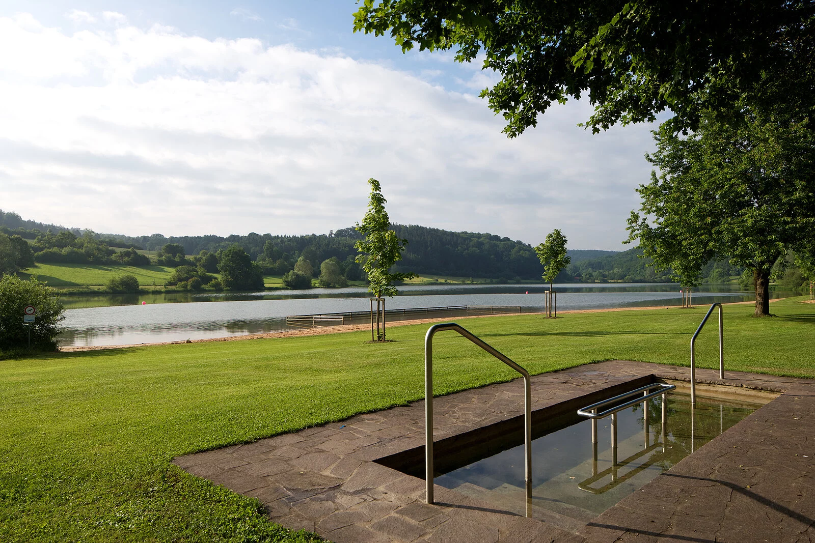 Die Freizeitanlage Hahnenkammsee mit Sanitäranlagen, Badestrand, Spielplatz, Beachvolleyballfeld, Tischtennisplatte, Kneipptretbecken, Strandhaus mit See-Terrasse, Bootsvermietung und Grillplatz erreichen Sie in wenigen Gehminuten.