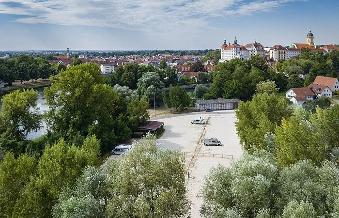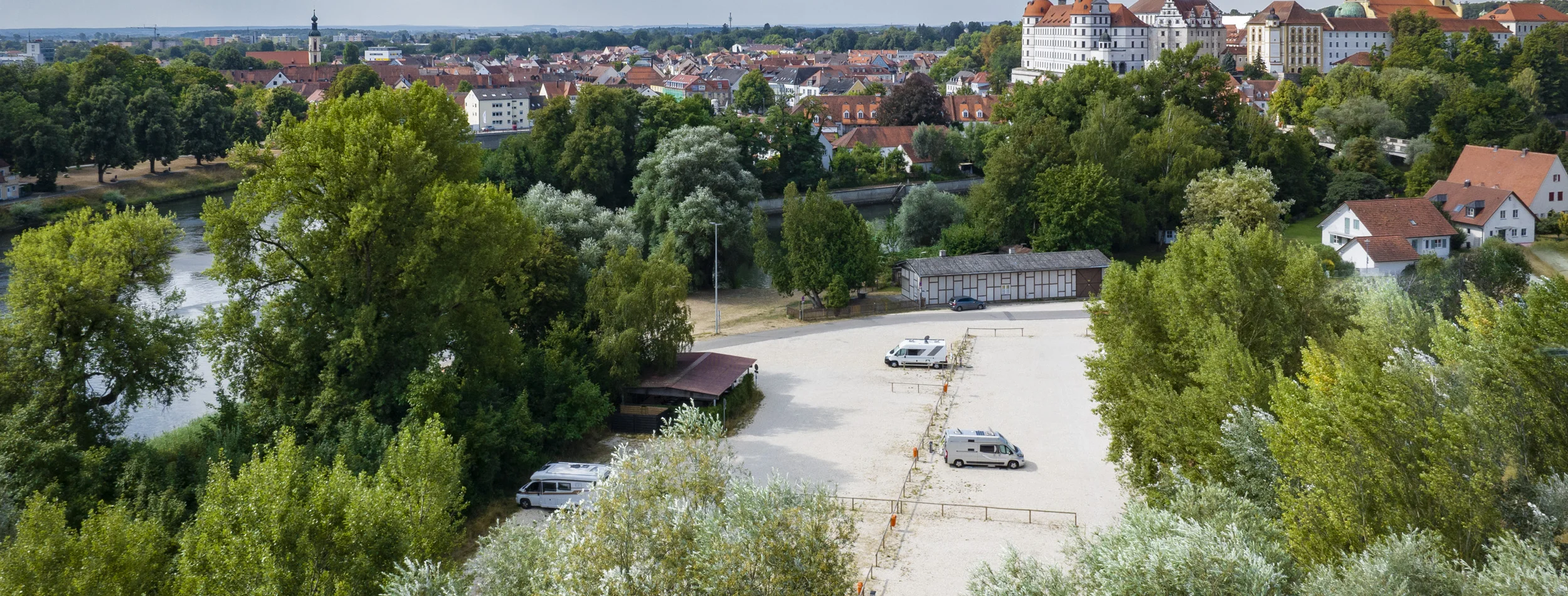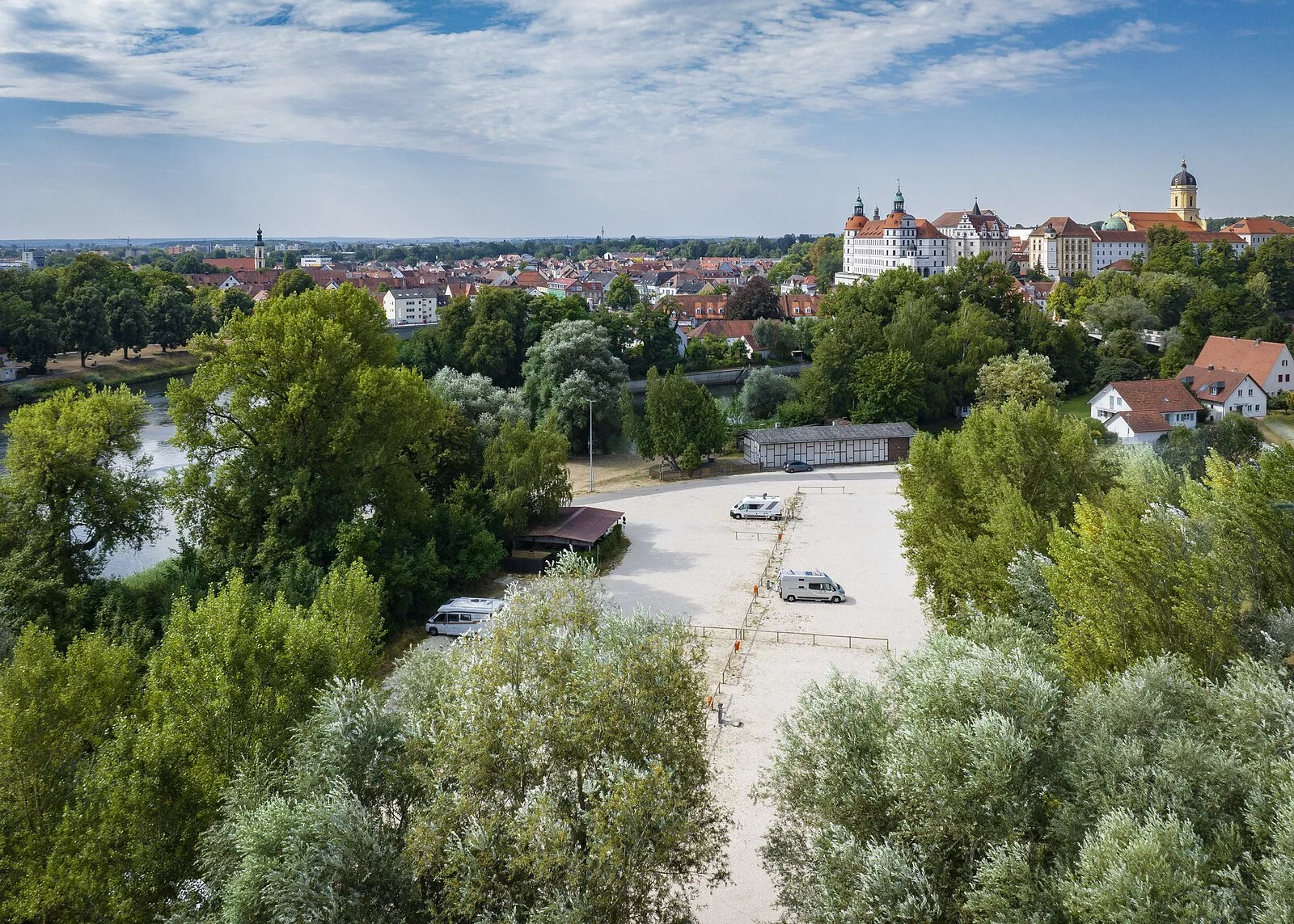 In Neuburg an der Donau liegt der Wohnmobilstellplatz idyllisch am nördlichen Donauufer neben dem öffentlichen Parkplatz "Schlösslwiese", direkt am Donaustrand.