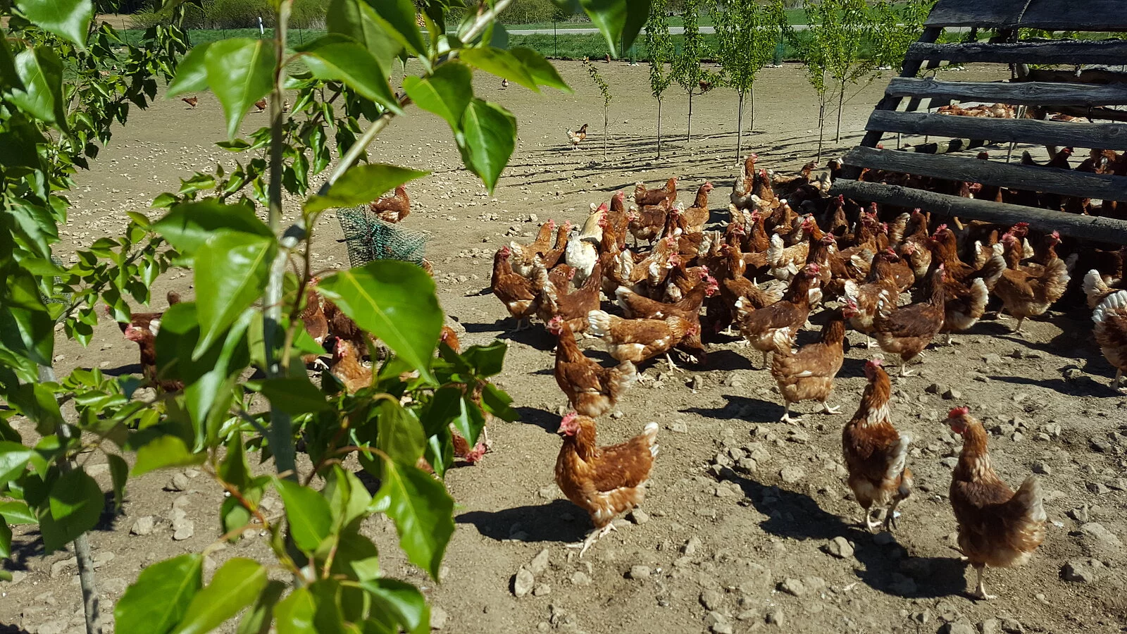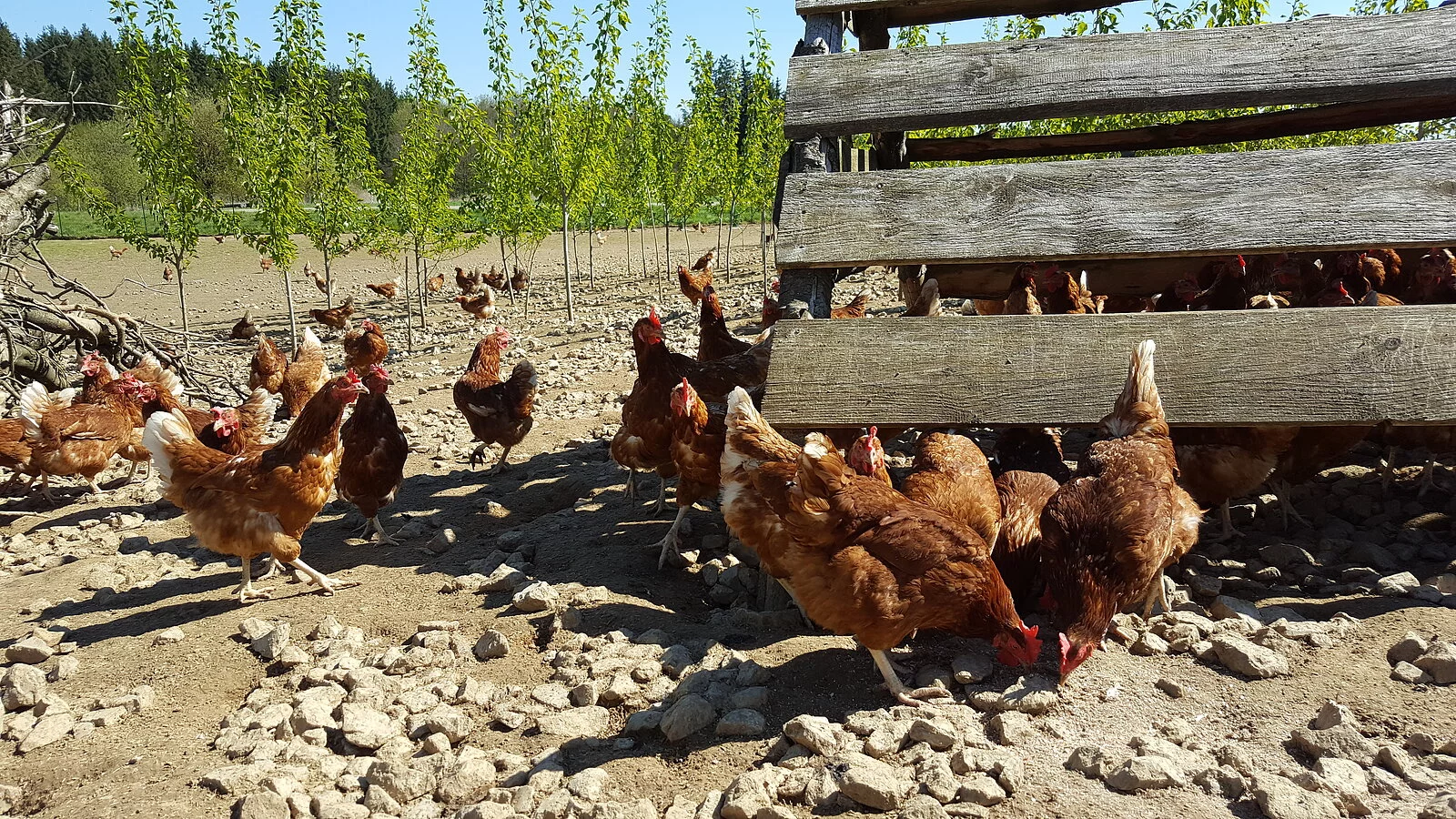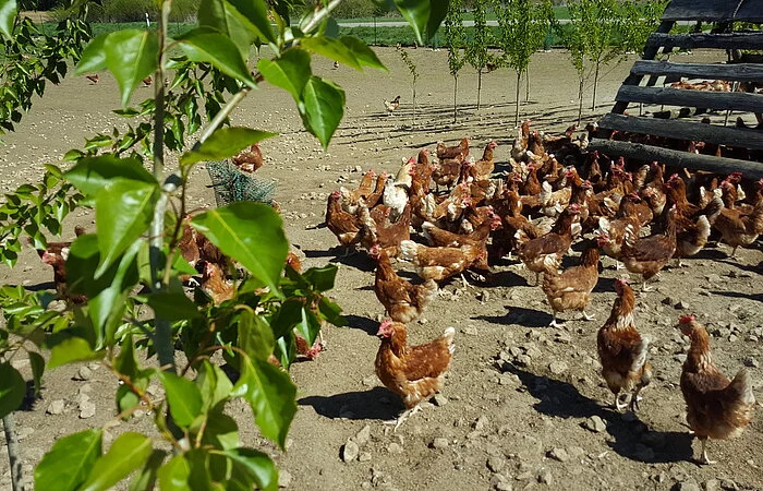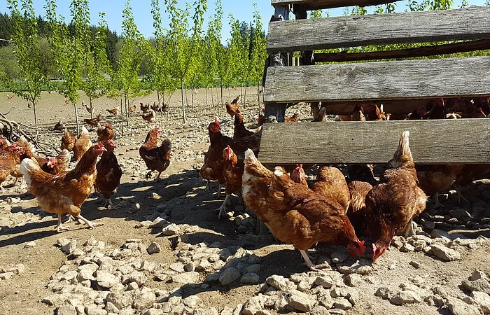 Der Stall entspricht den neuesten Anforderungen und Vorgaben von KAT (kontrollierte alternative Tierhaltungsformen) und Biokreis. Die Einrichtung bietet unseren Hennen alles für eine artgerechte Haltung und ermöglicht ihnen das Ausleben ihrer natürlichen Bedürfnisse. Dafür gibt es einen großen Wintergarten, der den Tieren jederzeit offen steht. Zudem können sich die Hennen auf der großen Freilandfläche bewegen und sich zusätzliche "Schmankerl" holen. Mittelstammbäume, Stroh- und Holzunterstände bieten auf den Freiflächen einen natürlichen Unterschlupf sowie Rückzugssorte.