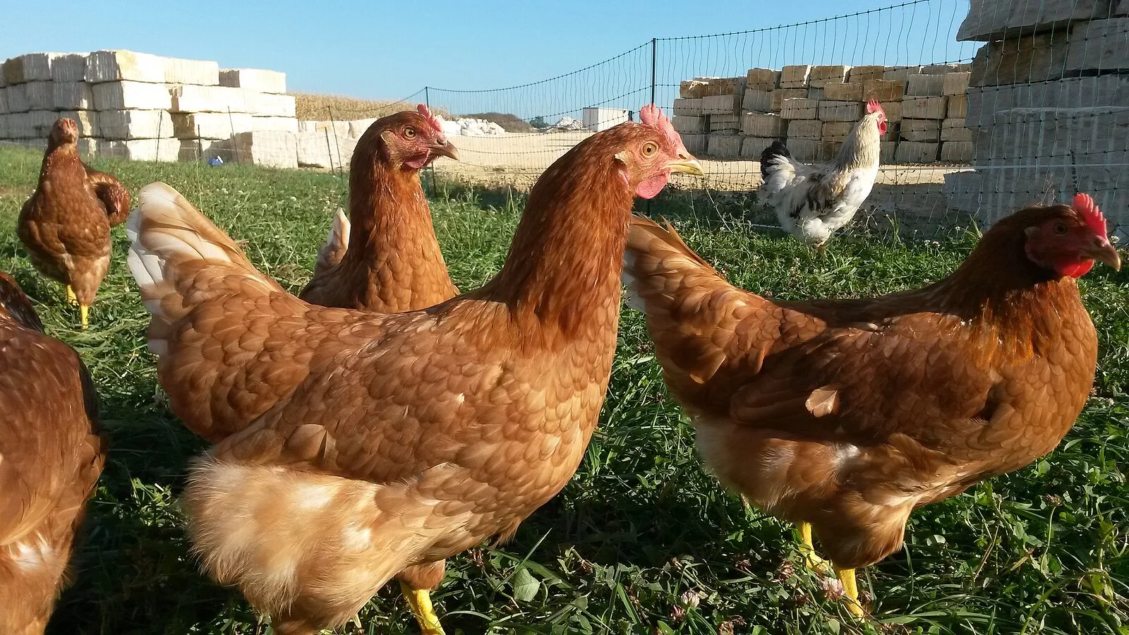 Die Futterbestandteile kommen zu 80 Prozent aus eigener Produktion. Neben Mais, Weizen, Ackerbohnen, Grascobs können die Hennen sich das saftige Gras auf der Weide schmecken lassen.