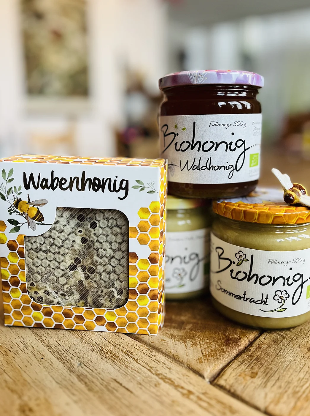 Jedes Glas ist ein Stück Natur aus unserer Heimat. Seit 2020 führen wir unsere Imkerei in Bio-Qualität. Neben verschiedenen Honigsorten bieten wir auch weitere Erzeugnisse aus dem Bienenstock an, darunter Pollen, Perga sowie Kerzen aus reinem Bio-Bienenwachs.