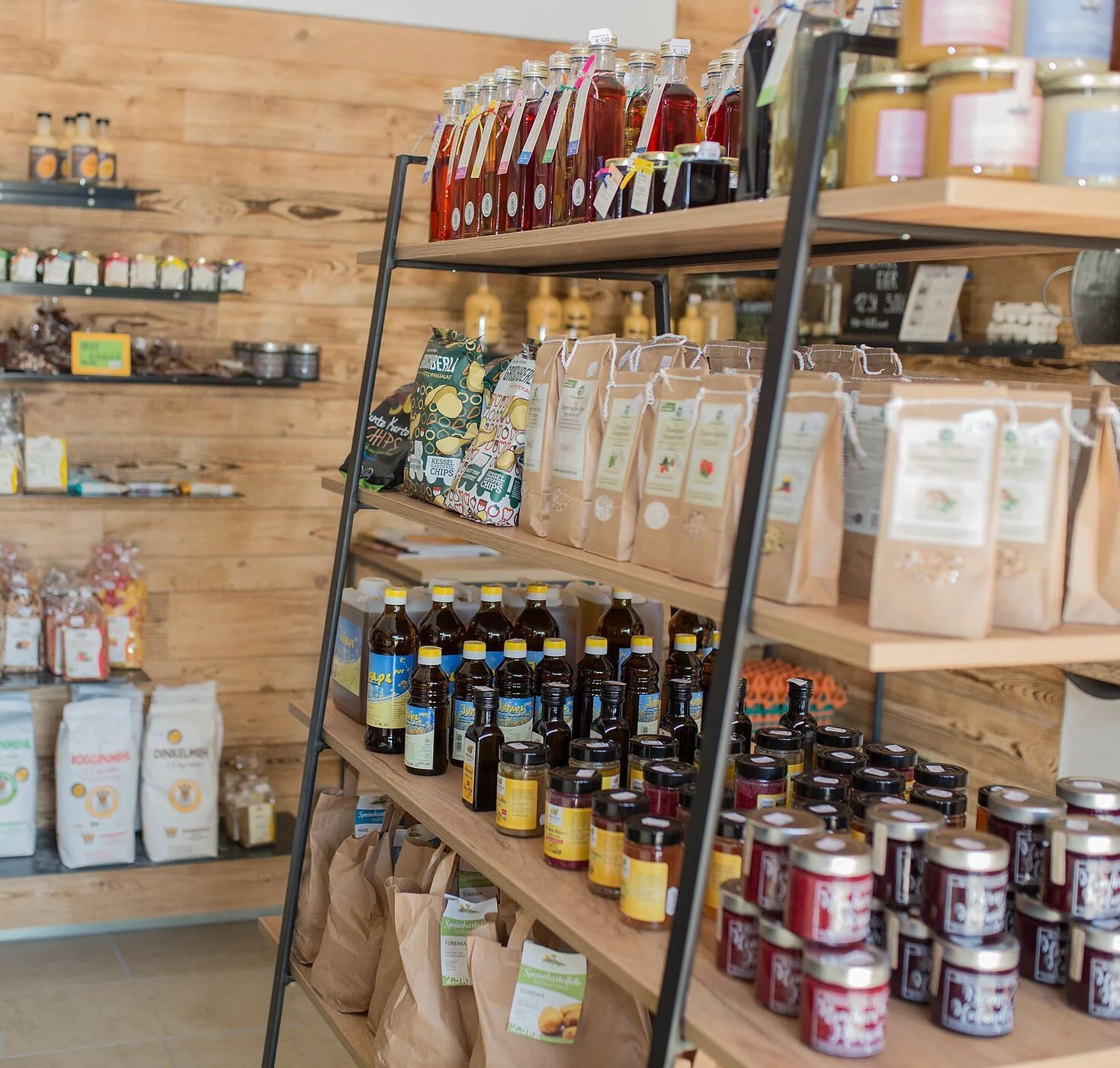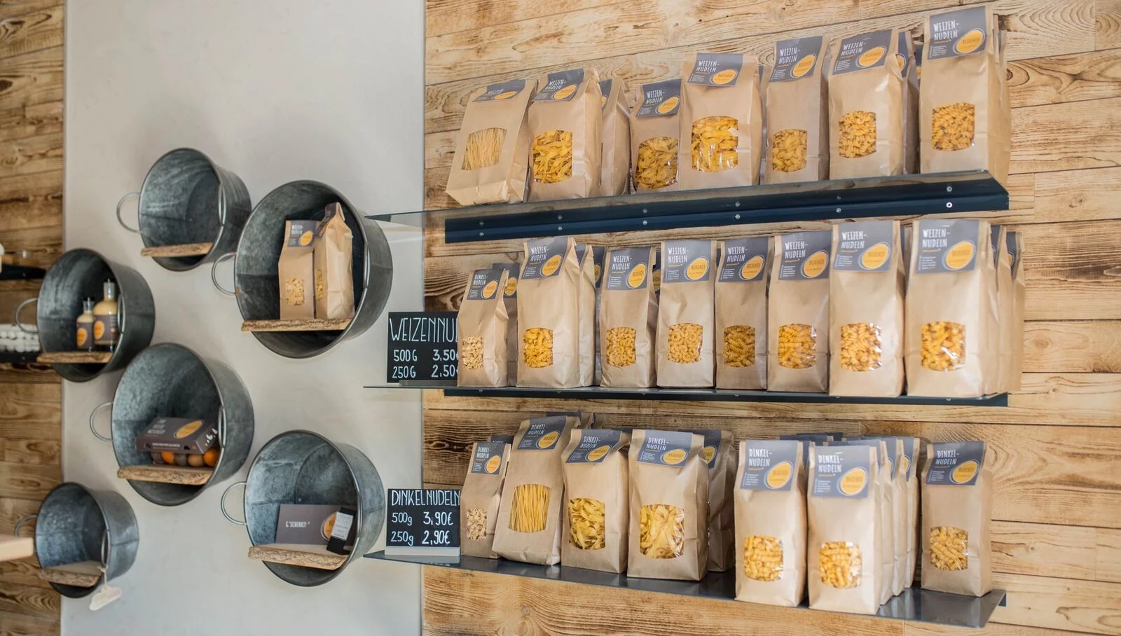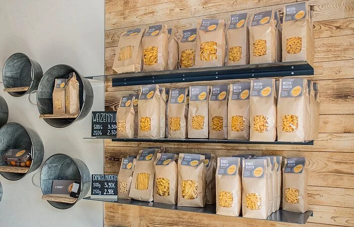 Wir haben auf unserem Hof einen Selbstbedienungsladen der Rund-um-die-Uhr offen hat. Dort gibt es leckere Eier, Nudeln und Geflügel von uns, aber auch viele weitere regionale Produkte aus der Region.