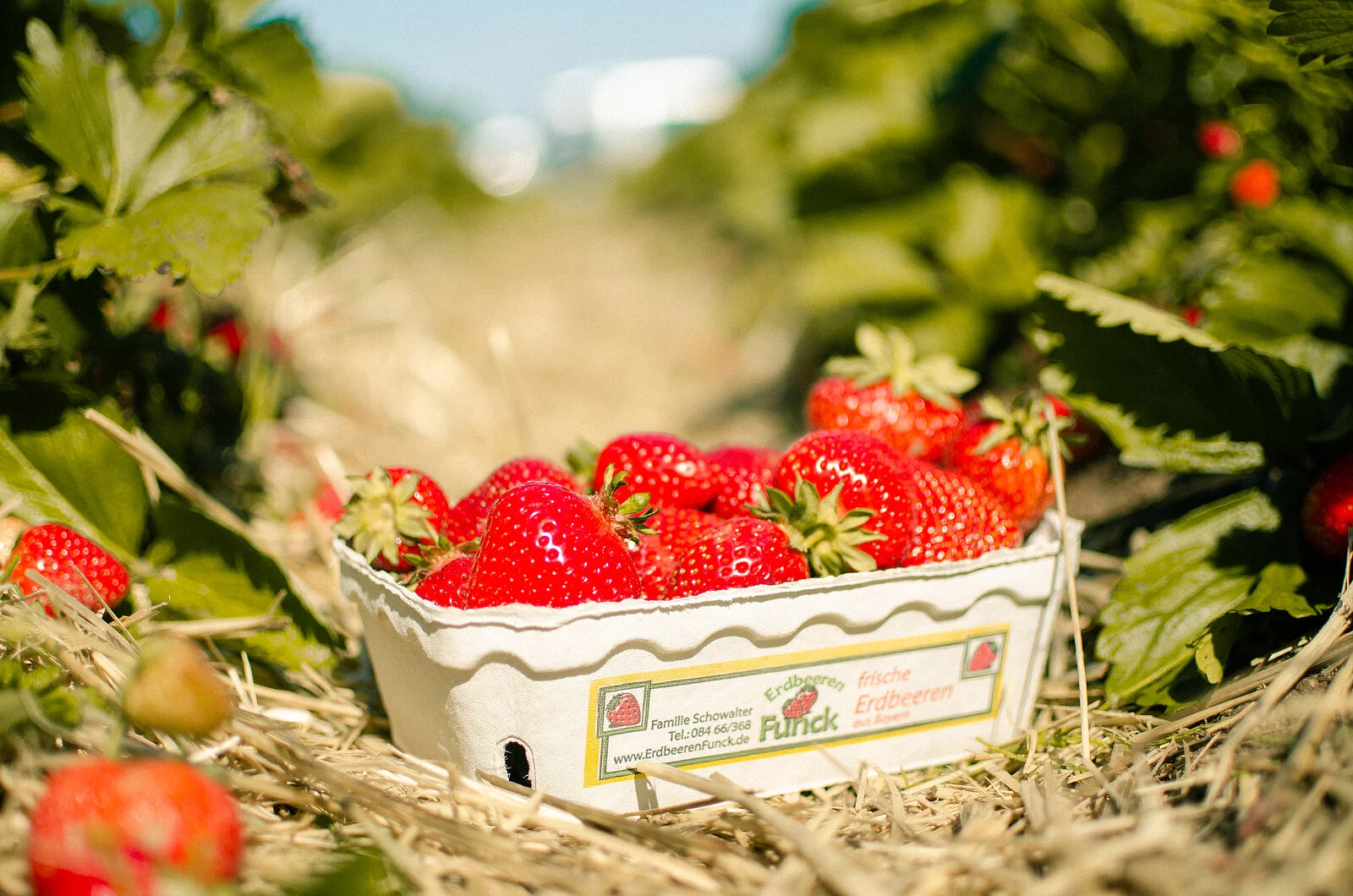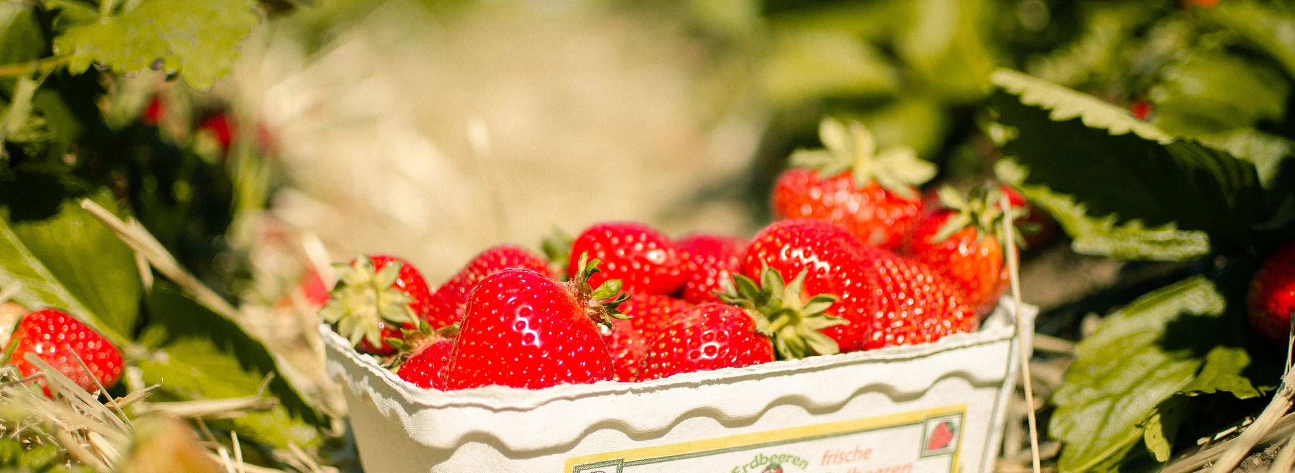 Von Ende Mai bis Ende Juli können Sie auf unseren Feldern Erdbeeren und Himbeeren pflücken.