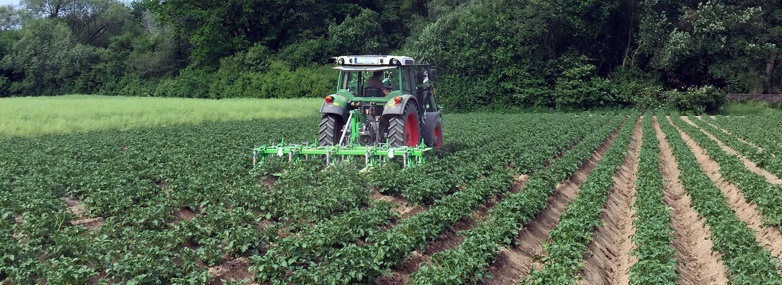 Ein gepflügtes Feld in dem in Bahnen auf dem grüne Kartoffelpflanzen sichtbar sind. im Hintergrund ein grüner Traktor, Bäume und hellblauer Himmel.Ein gepflügtes Feld in Bahnen ohne Bepflanzung. im Hintergrund ein gelber Traktor, Bäume und blauer Himmel.Traktor auf einem Feld mit jungen Pflanzen, umgeben von Bäumen im Hintergrund.Mehrere gelbe Kartoffeln, eine davon aufgeschnitten.