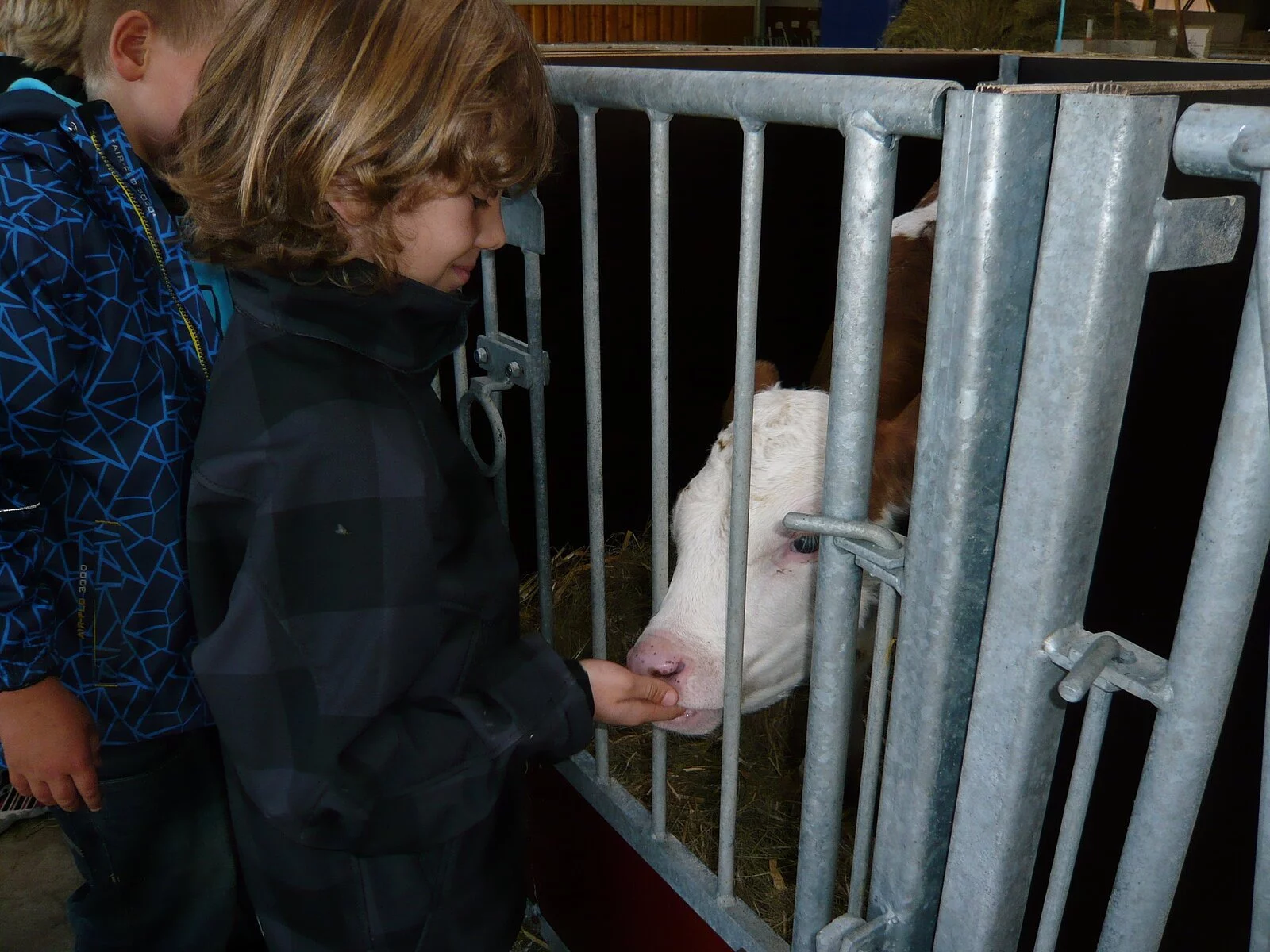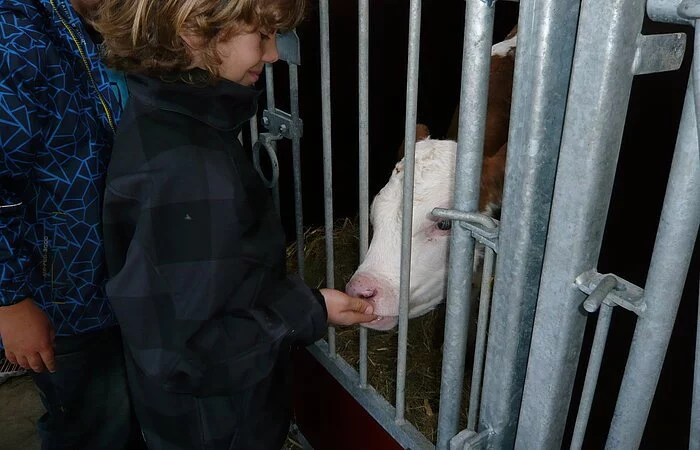 Zwei Jungen stehen vor einem Metallgitter im Kuhstall. Ein Kälbchen steckt seinen Kopf aus dem Gitter. Einer der beiden hält die Hand an seine Schnauze.Zwei weiße Plastikmilchflaschen mit grünem Produktaufkleber stehen auf einem weißen Brett. Die Milchflaschen haben verschiedene Größen, 1l und 0,5 l. Im Hintergrund sieht man eine Holzwand.