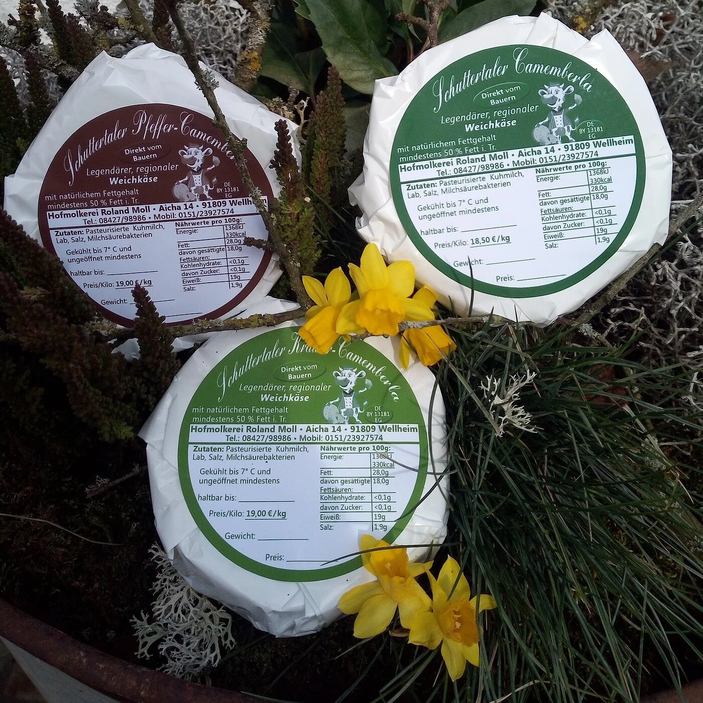 Auch unser "Camamberla" (5 verschiedene Sorten) wird im Verkaufskühlschrank und in verschiedenen Hofläden angeboten. Diese gehören mit zu den Favoriten unserer Kunden. Da der Käse mit pasteurisierter Milch hergestellt wird, ist er auch für Schwangere zum Verzehr geeignet!