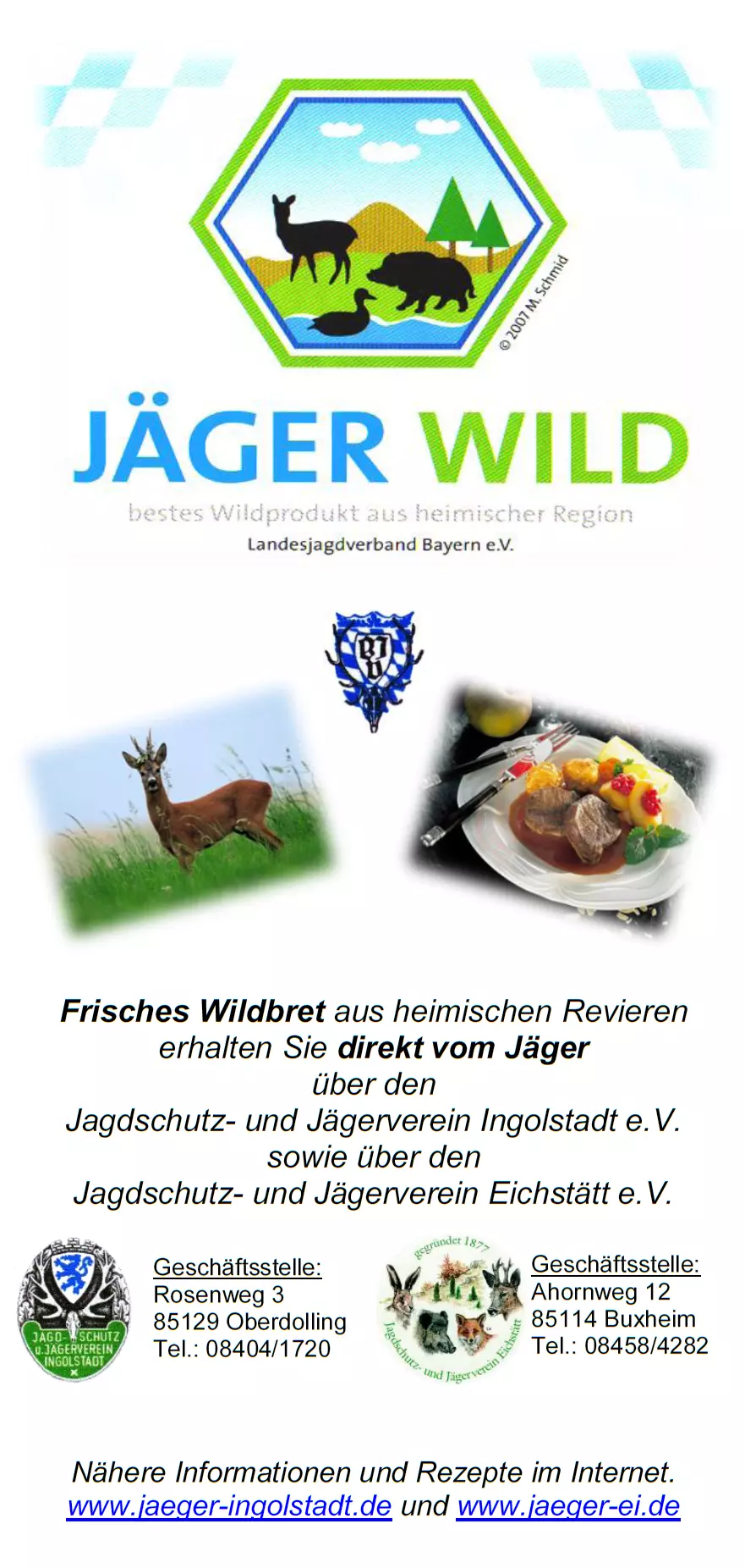 Frisches Wildbret aus heimischen Revieren erhalten Sie direkt vom Jäger über die Jagdschutz- und Jägervereine Ingolstadt e. V. und Eichstätt e. V.: