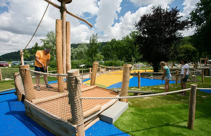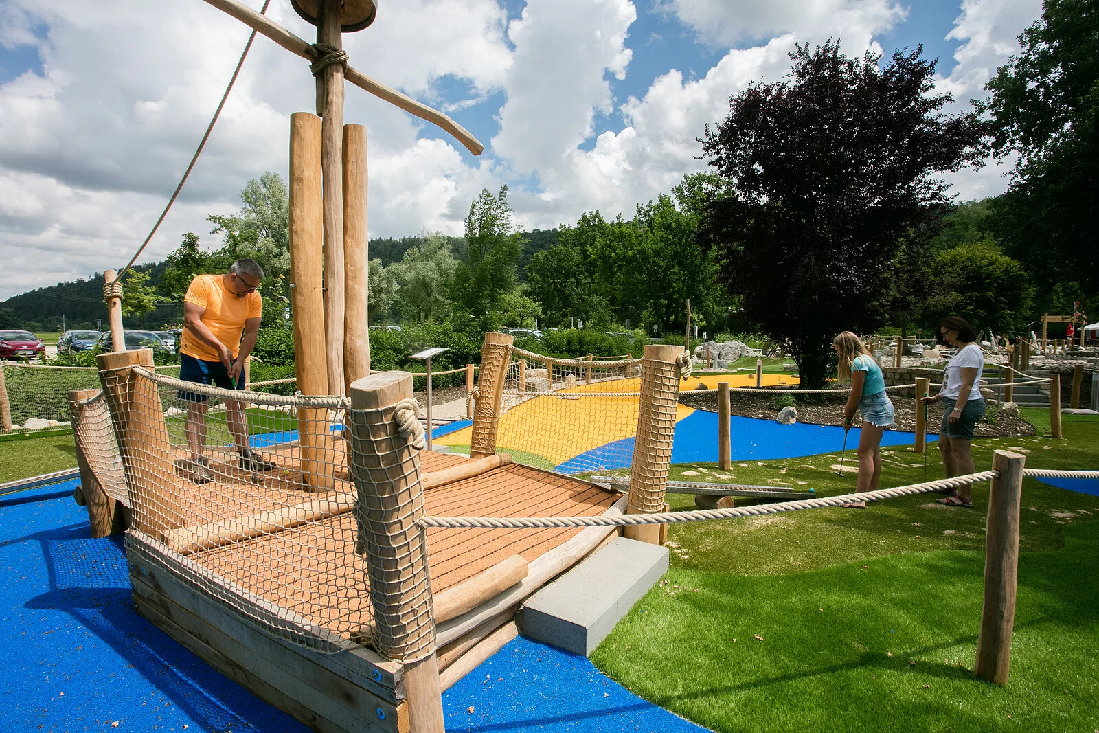 Die Abenteuer-Golfanlage - ein Freizeitspaß für die ganze Familie. Nicht nur Kinderaugen strahlen beim Anblick der bunten und abwechslungsreichen 18-Bahnen-Landschaft. Um den Parcour zu bezwingen müssen sich die Spieler an Dinosauriern und Krokodilen vorbei wagen, über Holzstege und Brücken balancieren, geschickt durch ein Wasserrad spielen, den Weg durch ein Knochenfeld finden und die größte Herausforderung, mit dem Floß über´s Wasser direkt am Hai vorbei schippern!