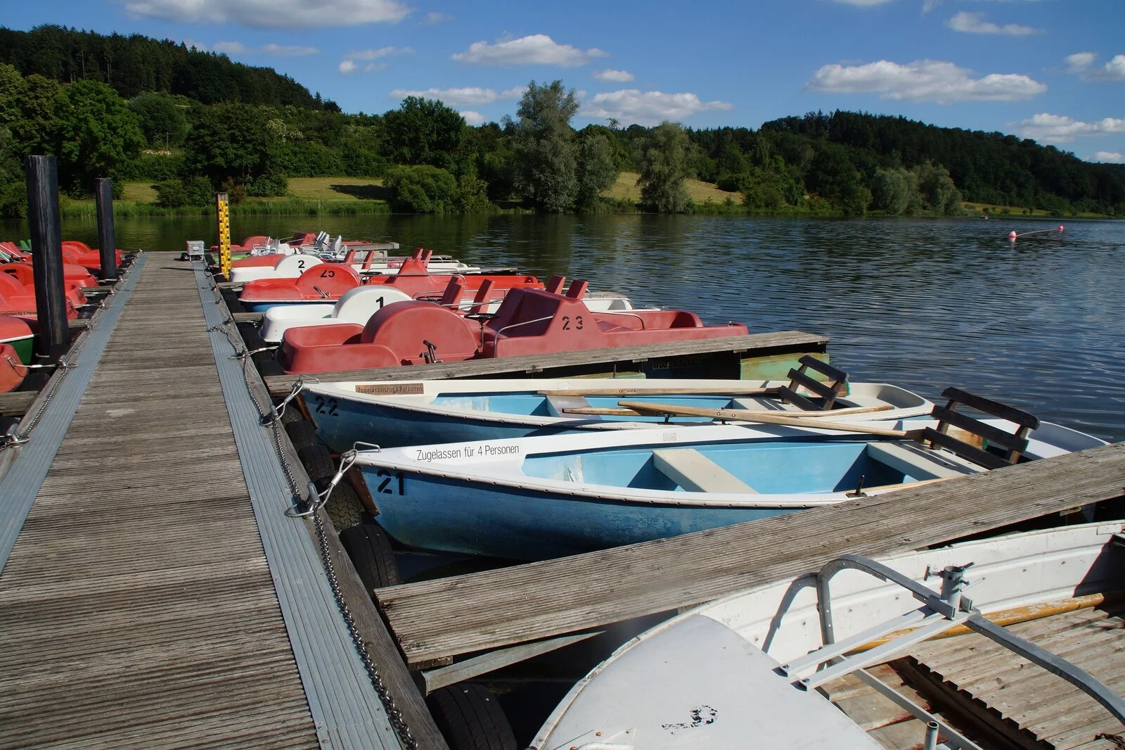 Tretboot: 10 EUR/Stunde, 7 EUR/halbe Stunde.