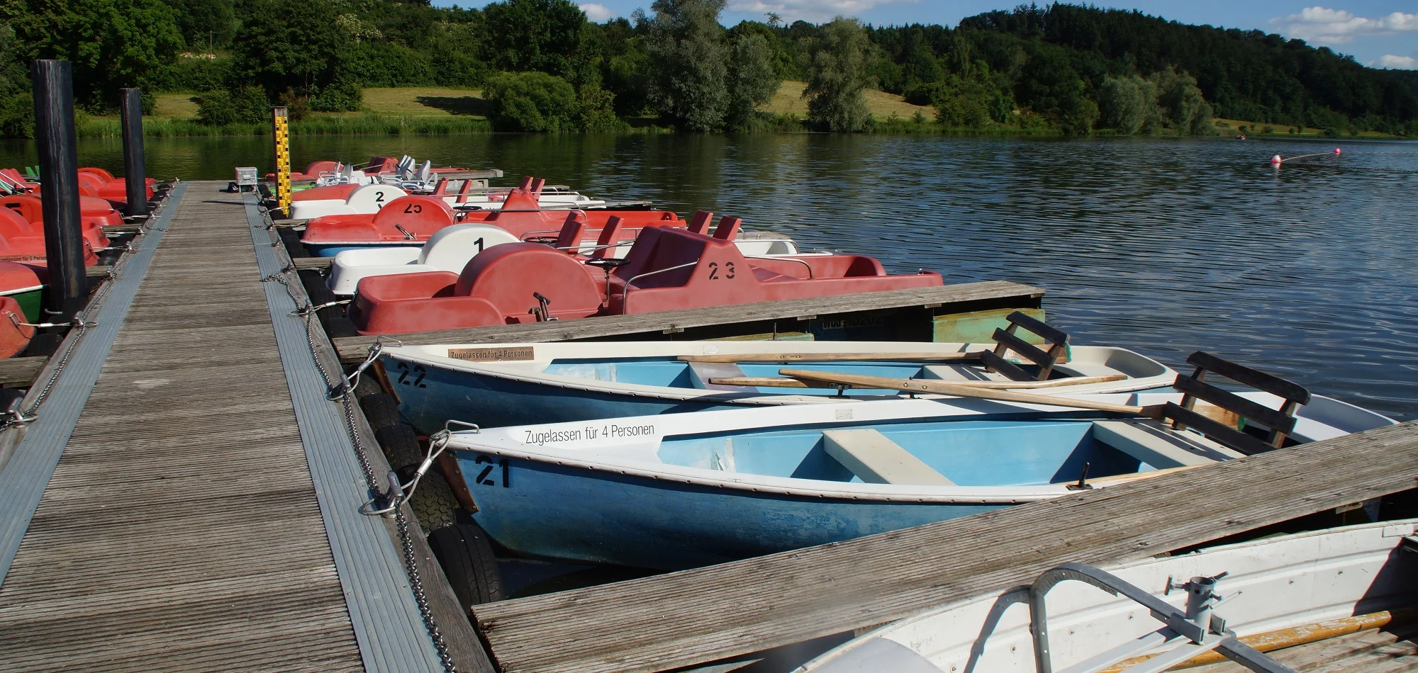 Ruderboot: 6 EUR/Stunde, 4 EUR/halbe Stunde.