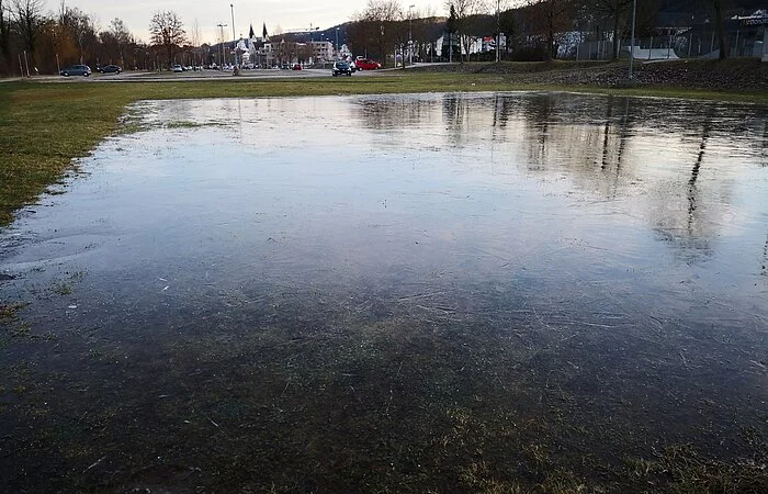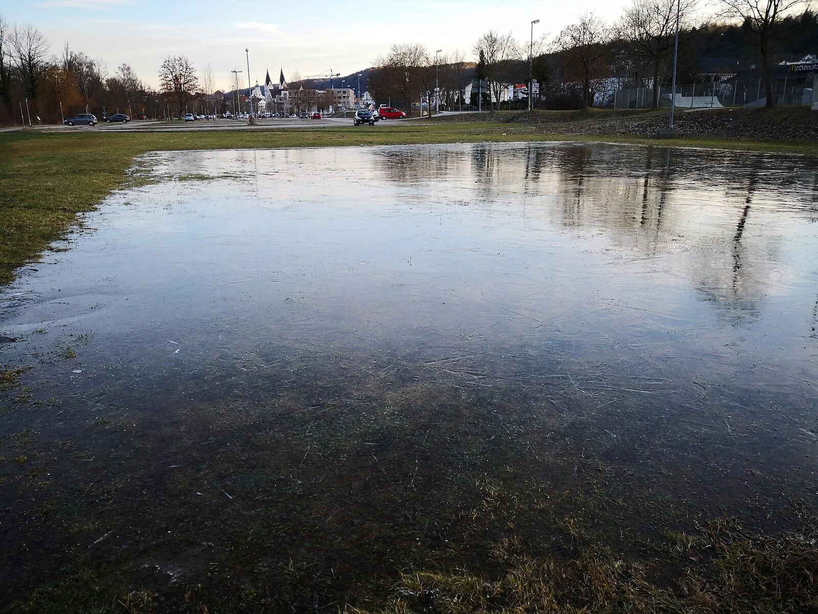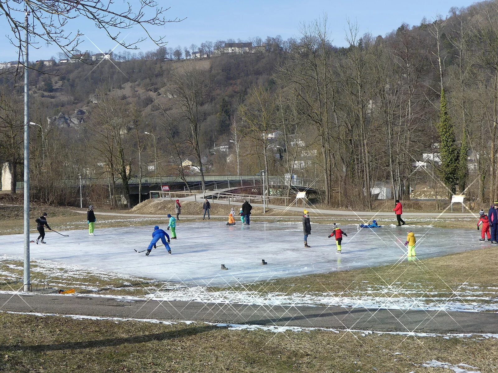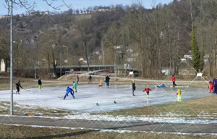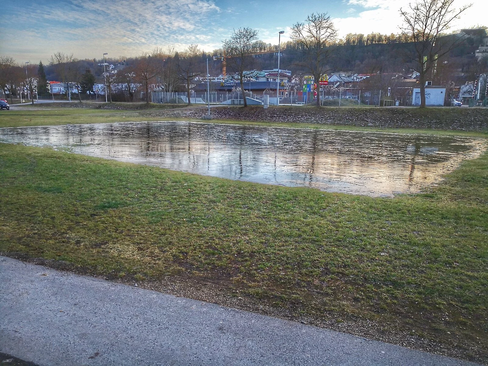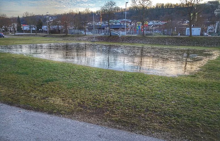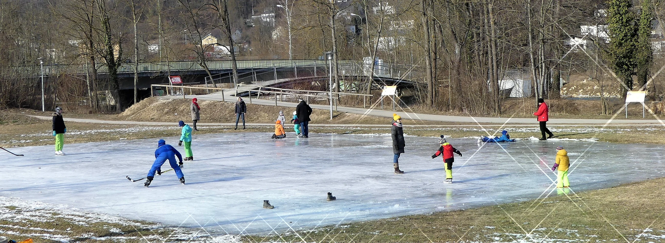 Wenn das Wetter es zulässt, kommt die Freiwillige Feuerwehr Eichstätt und flutet den Bereich auf der Maiswiese am Freiwasser. Dann steht der Eisstock Gaudi oder dem Schlittschuhlaufen nichts mehr im Wege.