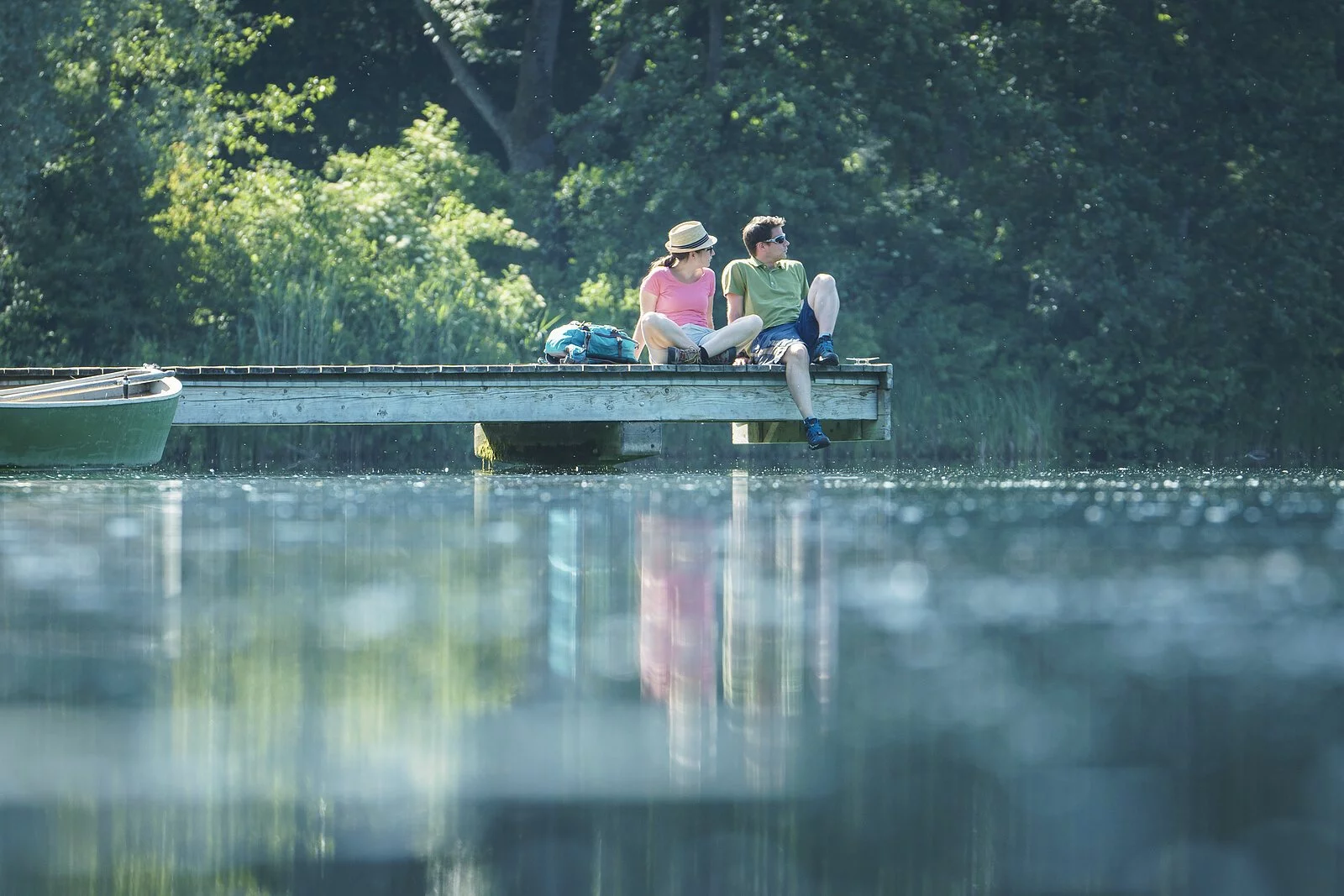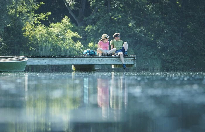 Ein Wanderpärchen sitzt auf dem Steg am Kratzmühlsee und lässt den Blick über den See schweifen. Hinter ihnen die Bäume und links am Steg ist ein Ruderboot befestigt.