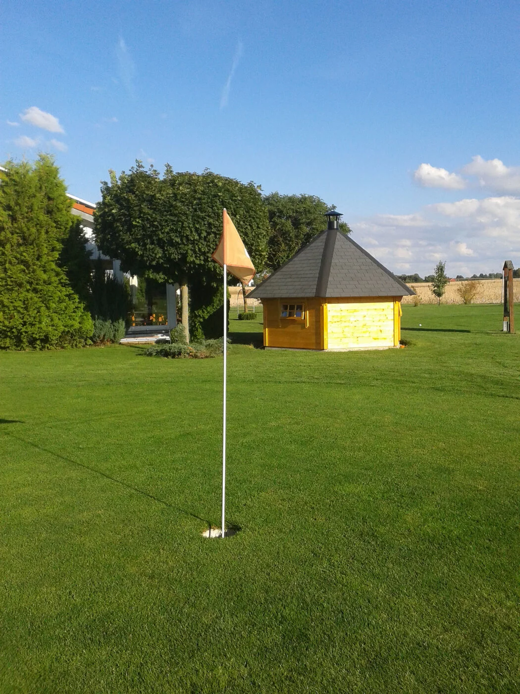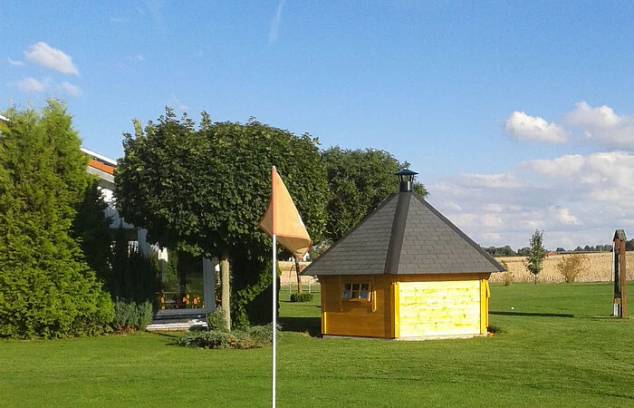 Ein besonderes Ambiente bietet das Grillhäuschen. Die Feuerstelle mit integriertem Grill und darum angelegtem Tisch für 15 Personen lädt zum Grillen und Verweilen in gemütlicher Atmosphäre auf dem Swin-Golf-Areal ein.