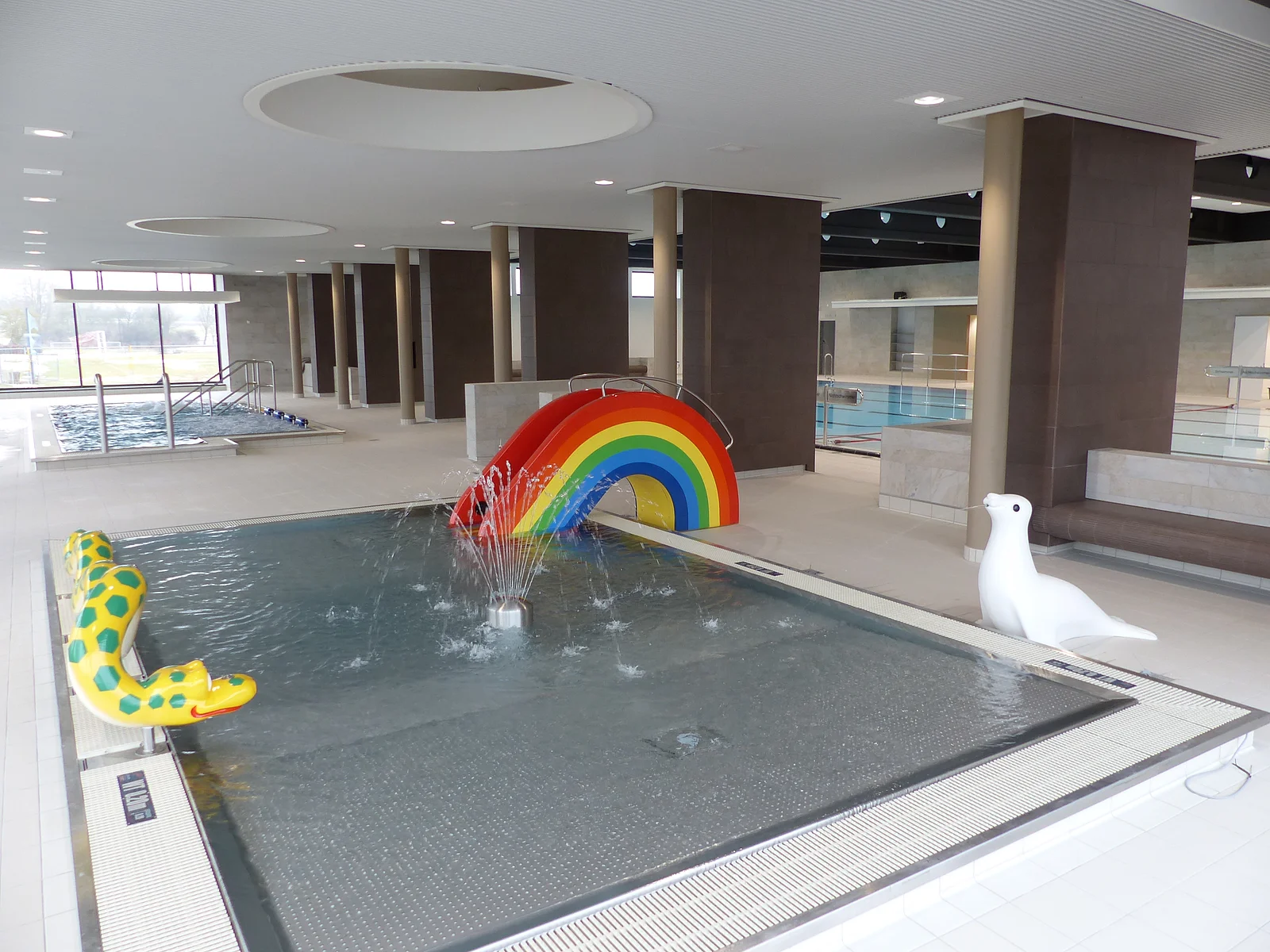 Innenansicht eines Schwimmbads mit mehreren Becken, Rutsche in Regenbogenfarben und Wasserspielen.Das Monheimer Hallenbad, das Jurabad, mit gefülltem Schwimmbecken, Startblöcken und großen Fenstern, die Tageslicht hereinlassen.Innenansicht eines Schwimmbades, dem Monheimer Jurabad: ein mit Wasser befülltes Schwimmbecken mit Stufen und Handläufen, umgeben von Fliesenboden. Der Rand des Beckens ist außenrum rosa/lila beleuchtet. Im Hintergrund stehen drei Liegestühle und eine Regenbogenrutsche, sowie ein weiteres Becken.Innenansicht eines Schwimmbads, dem Jurabad Monheim, mit Kinderbecken, Regenbogenrutsche und Wasserspielzeugen. Im Hintergrund ein weiteres Schwimmbecken und ein großes offenes Fenster.