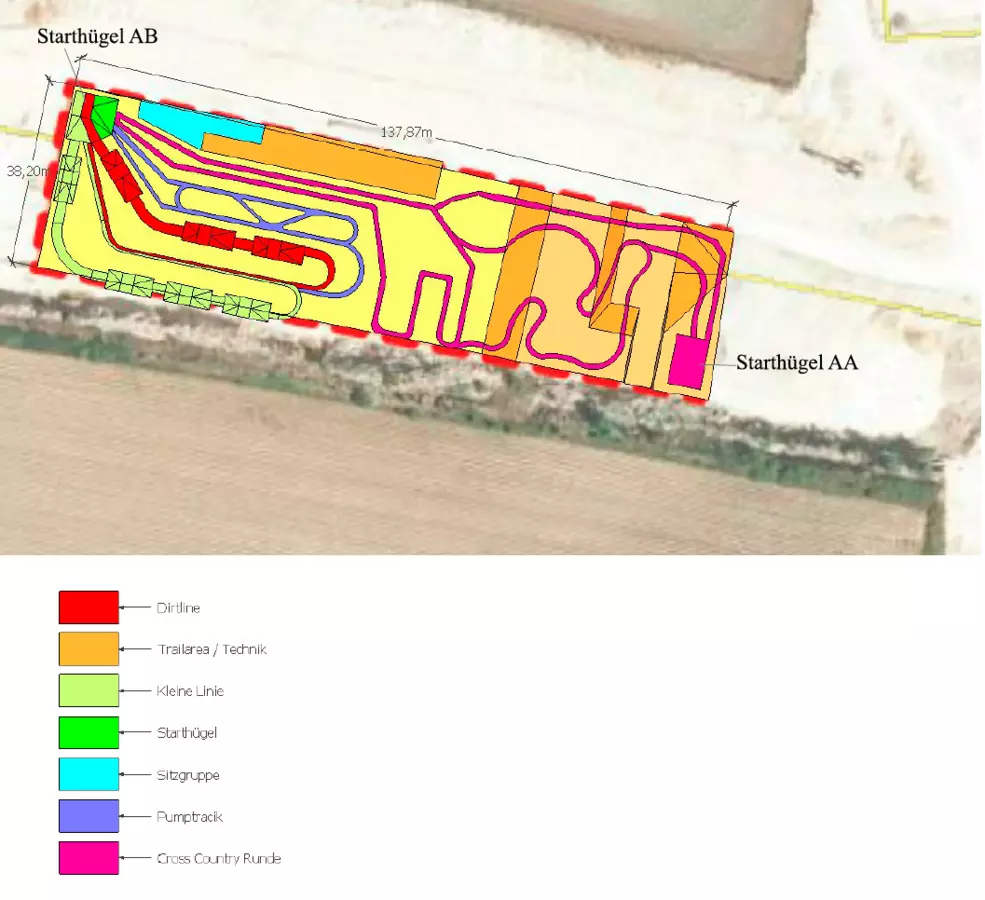 Aufgrund der Ost-Westausrichtung und der damit verbundenen Ausrichtung zur Sonne werden zwei Anfahrtshügel geplant. Die verschiedenen Sprungstrecken, sowie die Pumptrackstrecke bilden jeweils Rundstrecken ohne spitze Kreuzungspunkte, um das Unfallrisiko zu minimieren. Als Ausgangspunkt für die Strecken dient der neue Anfahrtshügel (AB).