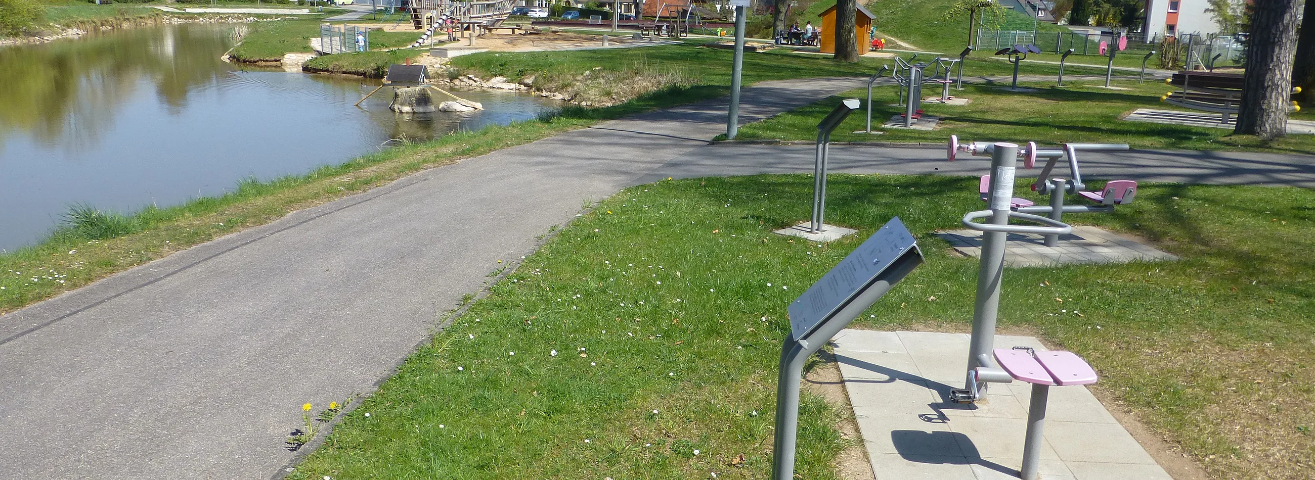 Auf dem Mehrgenerationenspielplatz am Bahnweiher können sich Kinder, junge Erwachsene, Senioren sowie Personen mit Gehhilfen körperlich betätigen.