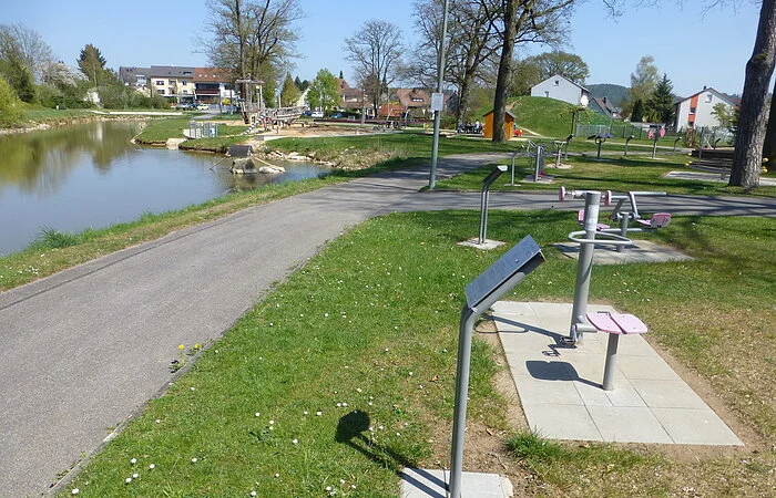 Auf dem Mehrgenerationenspielplatz am Bahnweiher können sich Kinder, junge Erwachsene, Senioren sowie Personen mit Gehhilfen körperlich betätigen.