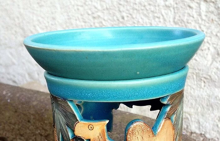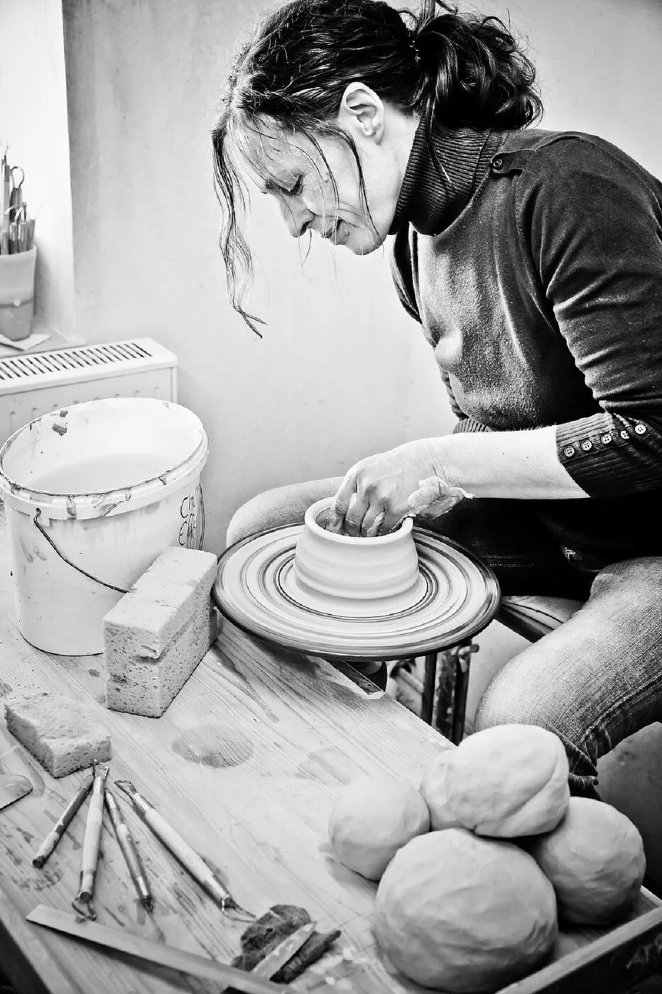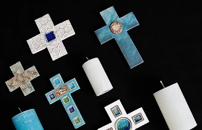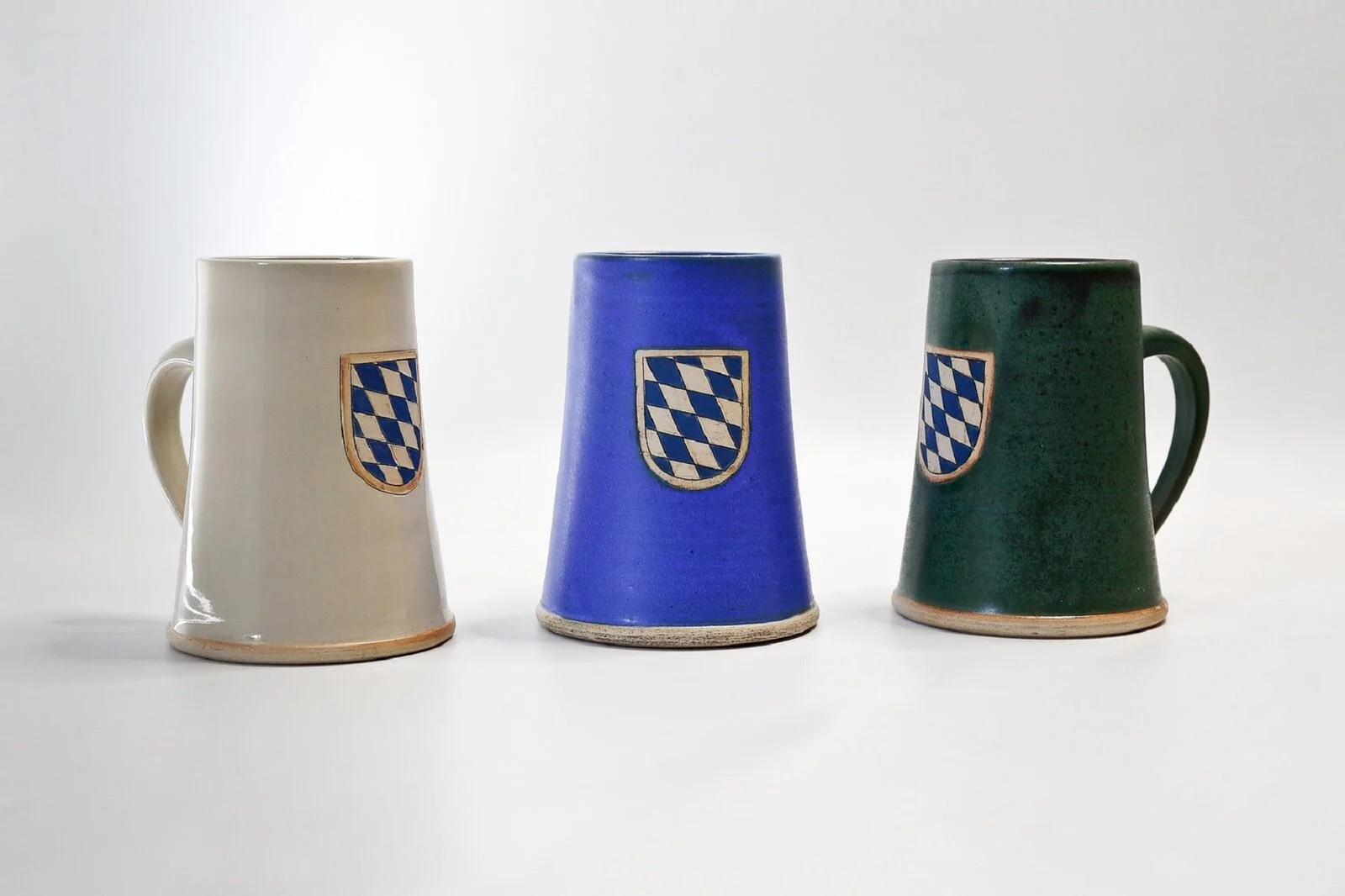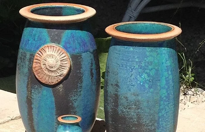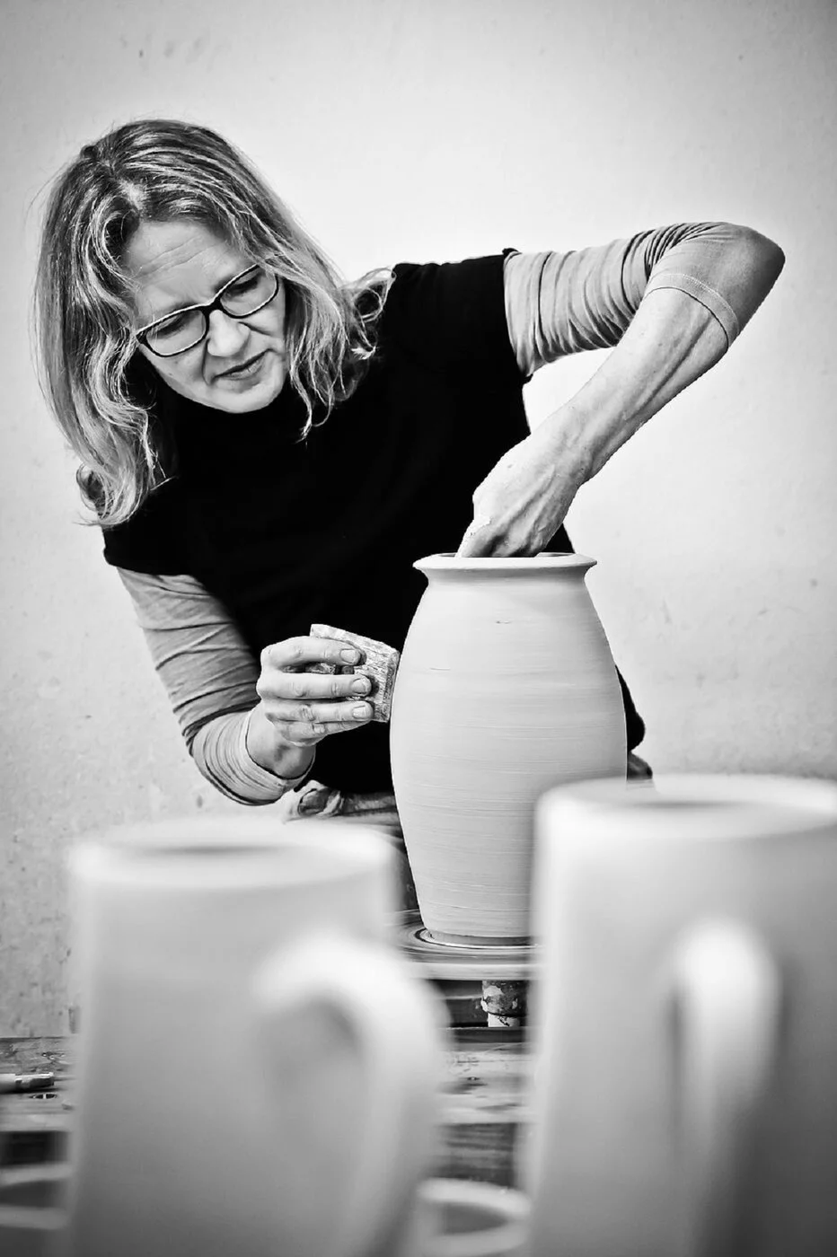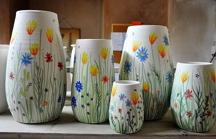 Jedes Stück wird auf der Drehscheibe gedreht oder frei aufgebaut. Alle Produkte werden bei 1250 °C dicht gebrannt und von Hand glasiert.