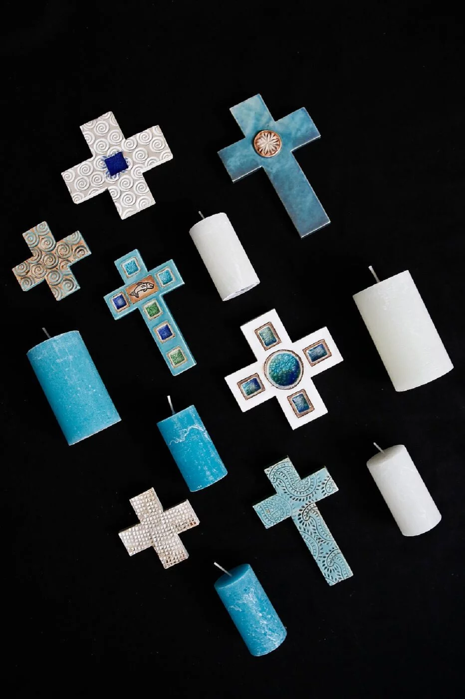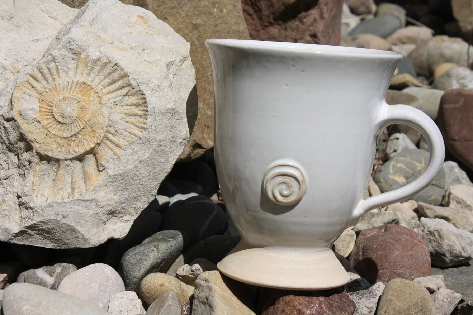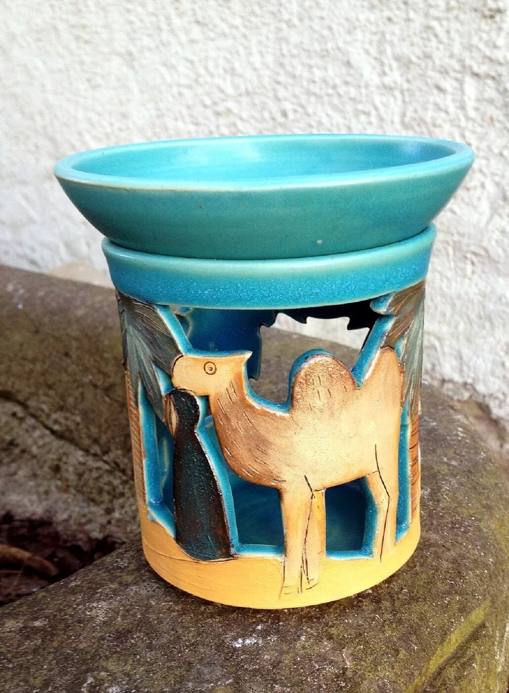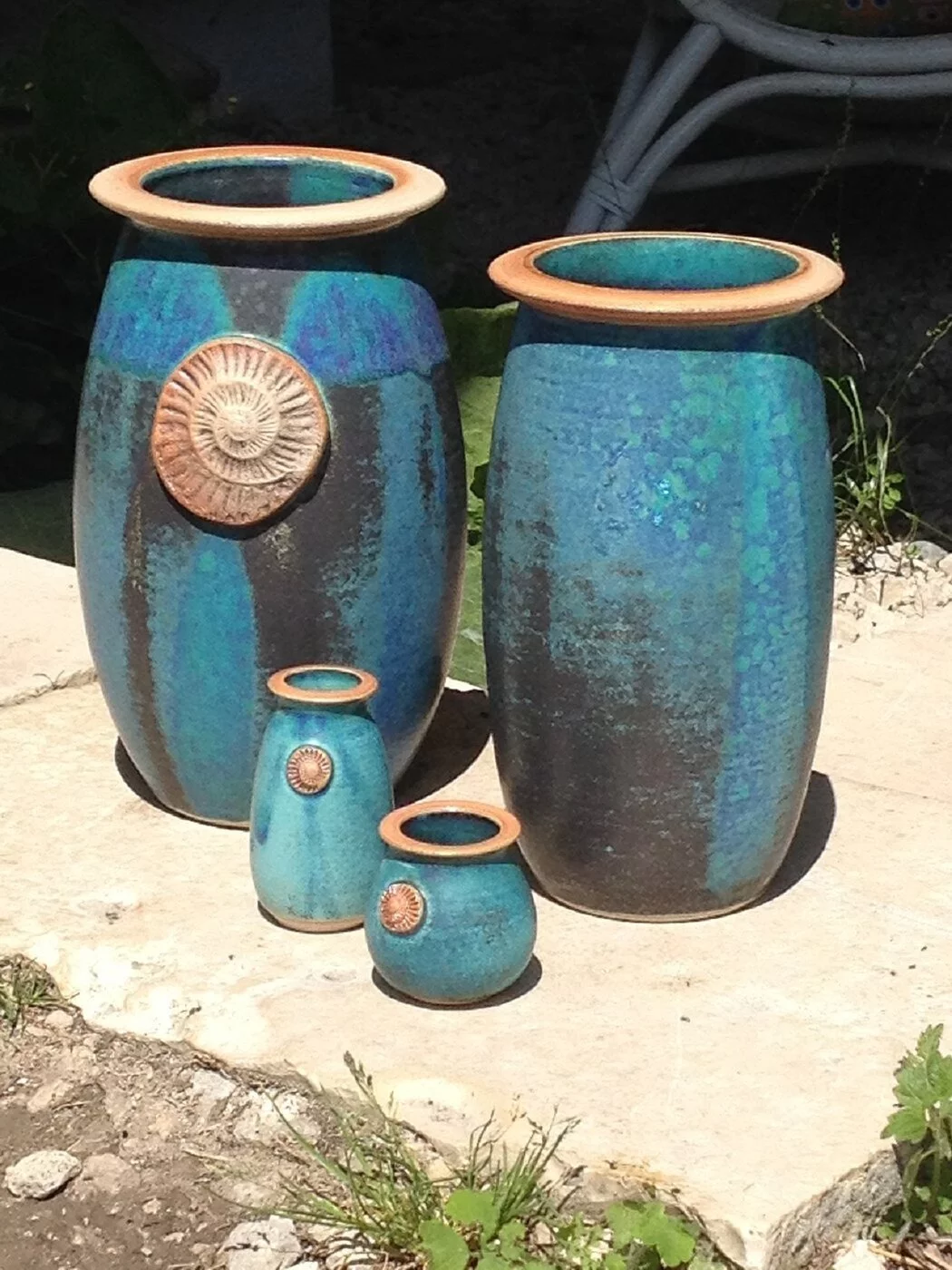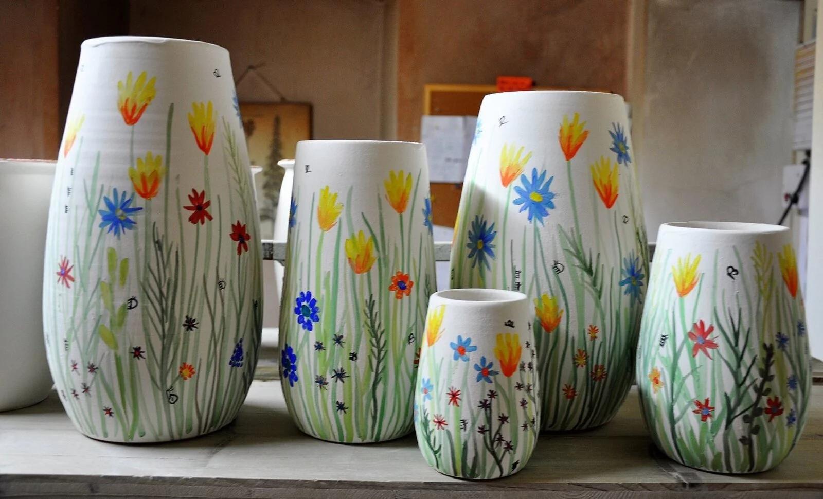 Jedes Stück wird auf der Drehscheibe gedreht oder frei aufgebaut. Alle Produkte werden bei 1250 °C dicht gebrannt und von Hand glasiert.