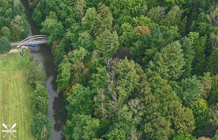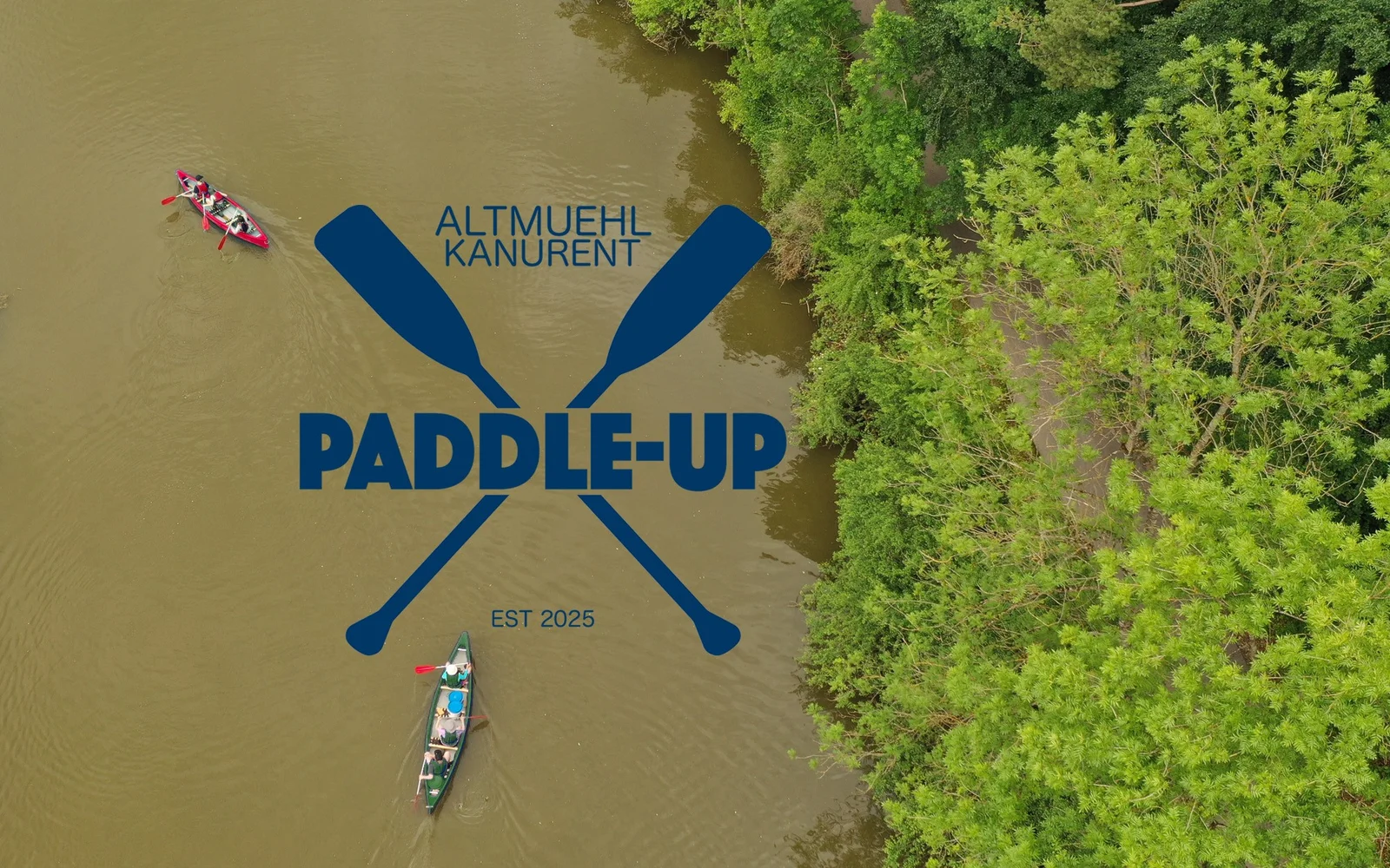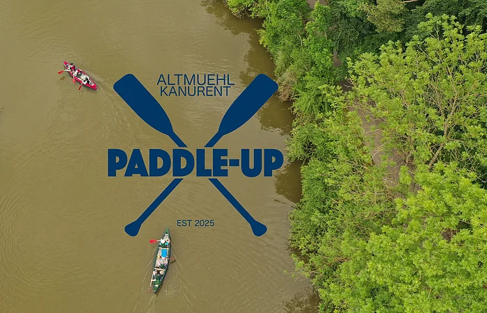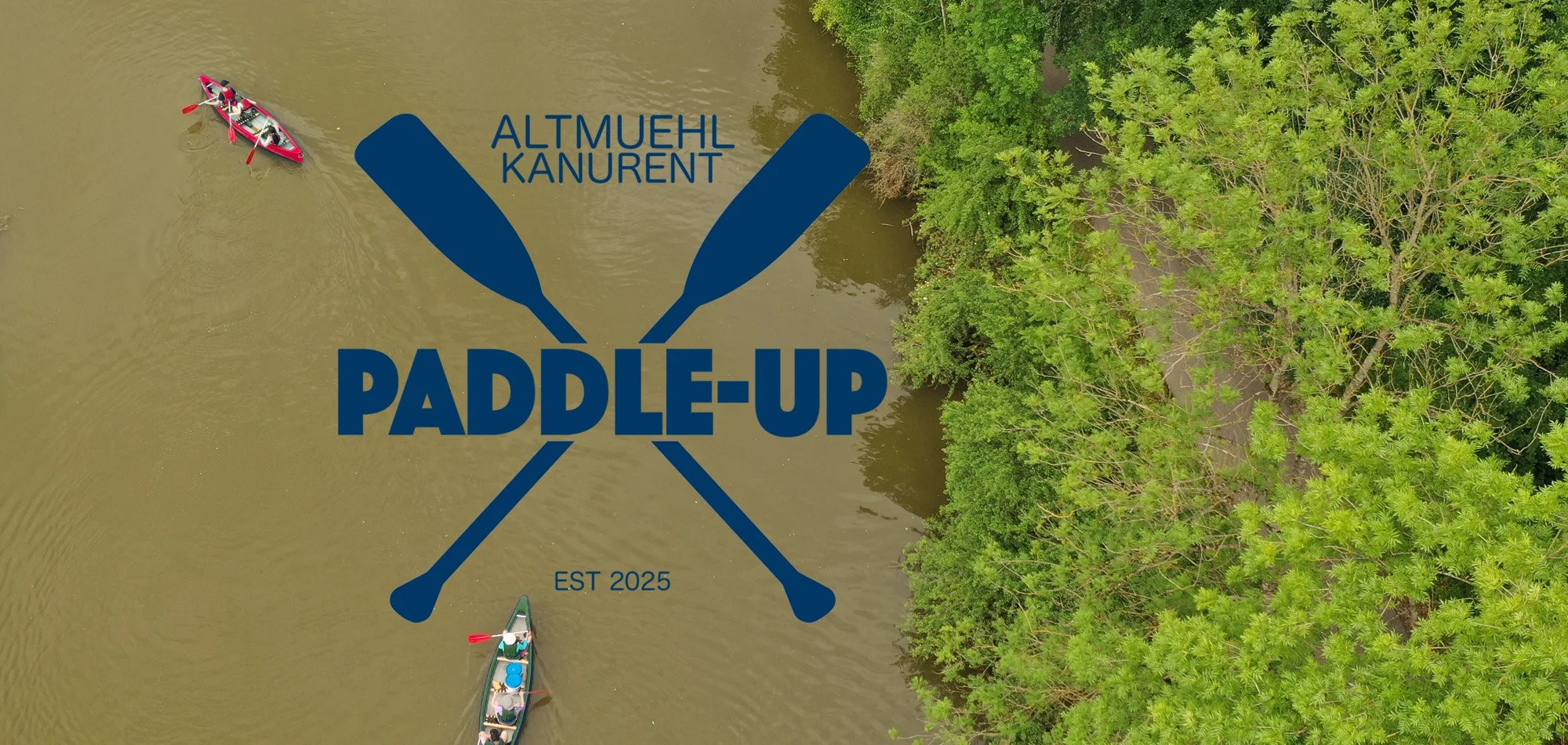 Kanufahrer in Altmühl mit Logo Paddle-Up in BildmitteFamilie in einem Kanu auf einem Streckenabschnitt der Altmühl, bei dem Bäume aus dem Wasser ragen.Kanufahrer auf der Altmühl aus der Vogelperspektive. Links im BildRote Kanus oder Kajaks aus der Vogelperspektive auf der Altmühl.Luftaufnahme eines Flusses mit grünem Ufer und einem kahlen Baum im Wasser. Logo mit gekreuzten Paddeln links unten.Bootswandern auf der Altmühl. Zwei Boote mit mehreren Personen. Der Fluss ist von grüner Natur umgeben, Bäume ragen aus und ins Wasser.Kanufahrer im Wasser mit stärkerer Strömung.Luftbildaufnahme Wald und Altmühl mit Brücke. Einstiegsstelle von Kanus und in die Altmühl.