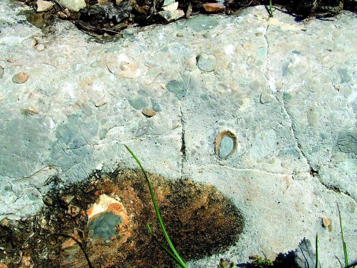 Durch viele Schuhe im Laufe der Jahre glatt poliert zeigen sich Muscheln, Ammoniten und andere Riffbewohner, die hier als Fossilien erhalten sind. Auch an den Felsen in der näheren Umgebung findet man zahlreiche Fossilien. Dies ist ein eindeutiges Zeichen für den Ursprung der Kalkschichten aus dem Jura-Meer.