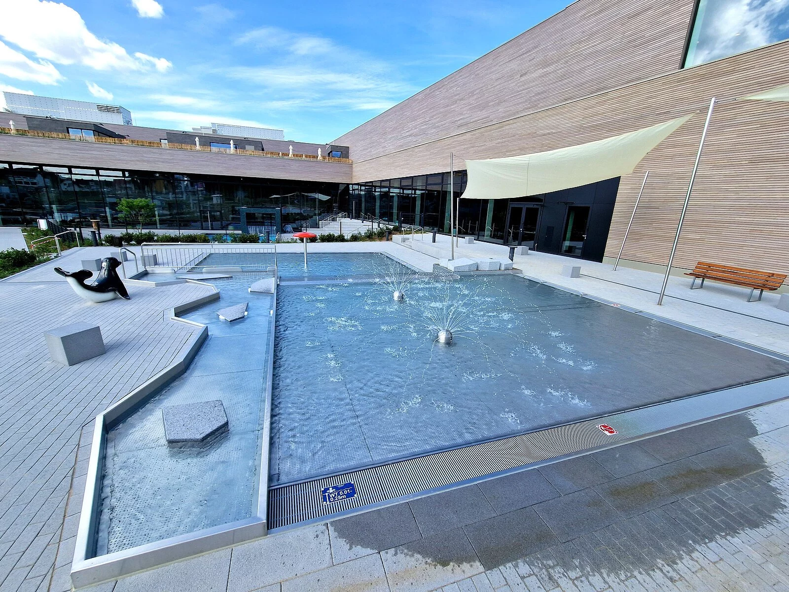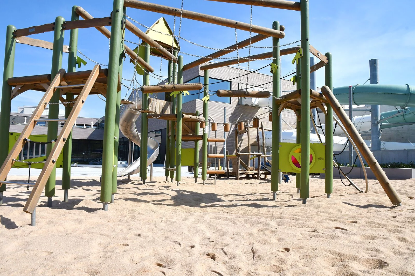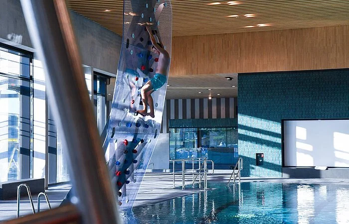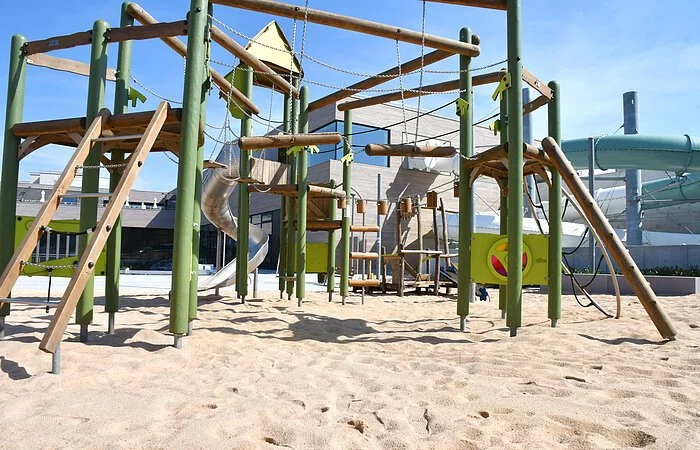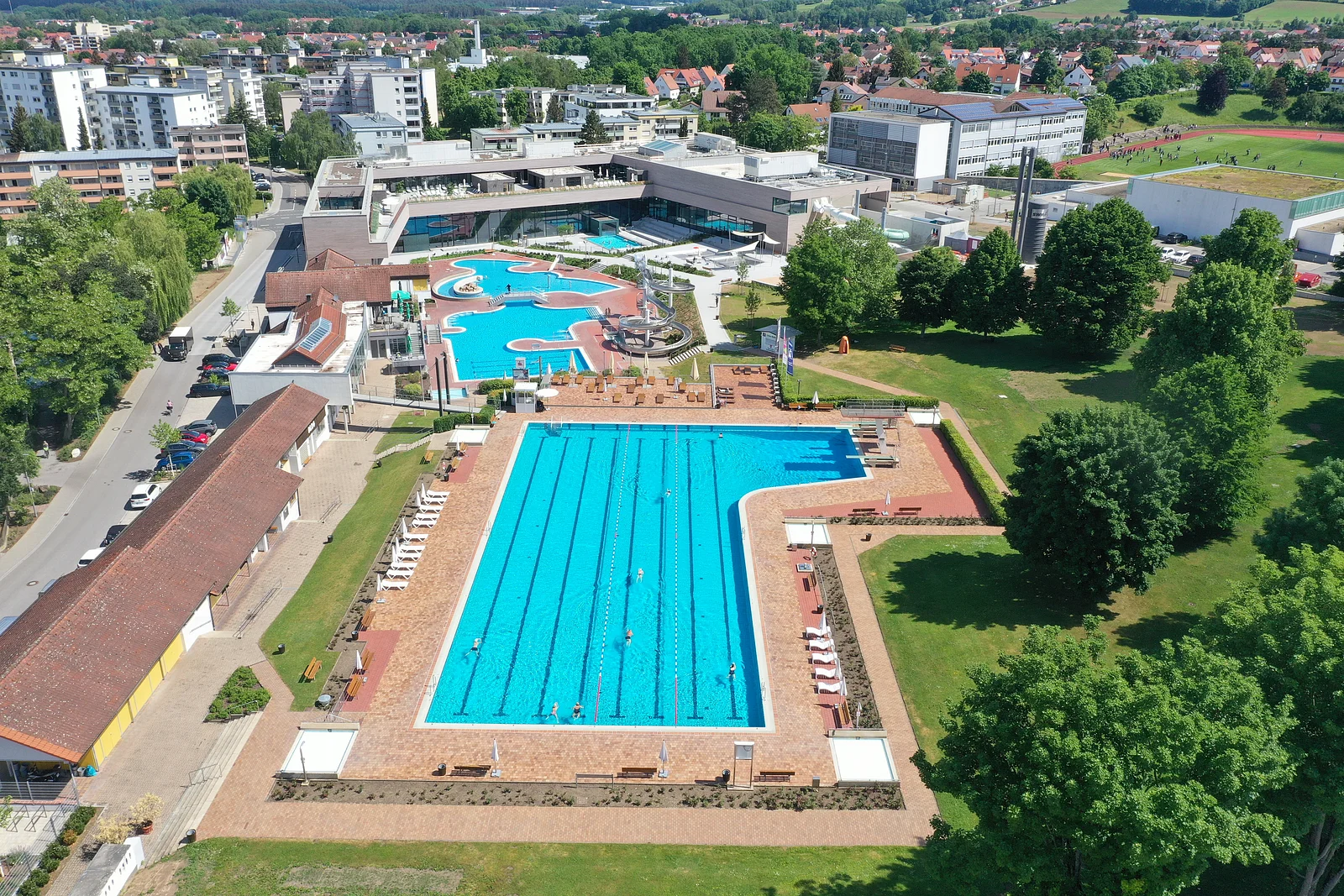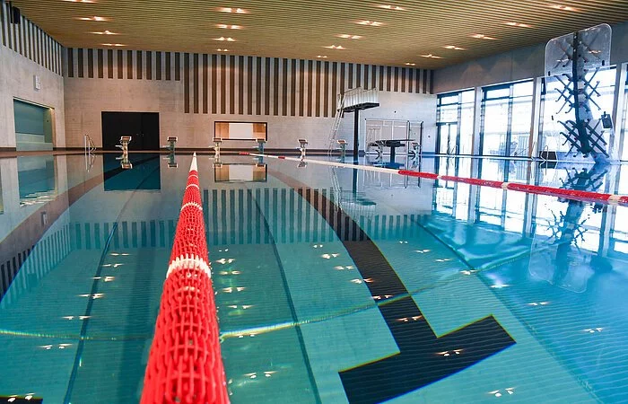Großes Erlebnispotenzial bietet die Wasserwelt im Erdgeschoss der neuen Anlage. Mit dem wettkampftauglichen 25 Meter-Sportbecken einschließlich Sprunganlage und „Waterclimbing“, einem Erlebnisbecken mit Strömungskanal und Schaukelbucht, aber auch dem wohlig-warmen Sole-Außenbecken, werden viele Wünsche wahr. Fitness und Gesundheit stehen im Kursbecken mit Hubboden im Vordergrund. Und natürlich gibt es für die Kleinsten ein Kinderbecken mit Spritztieren, Spielbach und separatem Rutschenbereich: Spiel und Spaß sind somit garantiert. Das gemütliche Restaurant mit Kinderbereich bietet neben Pizza, Pasta und Pommes saisonale Köstlichkeiten aus der Region.