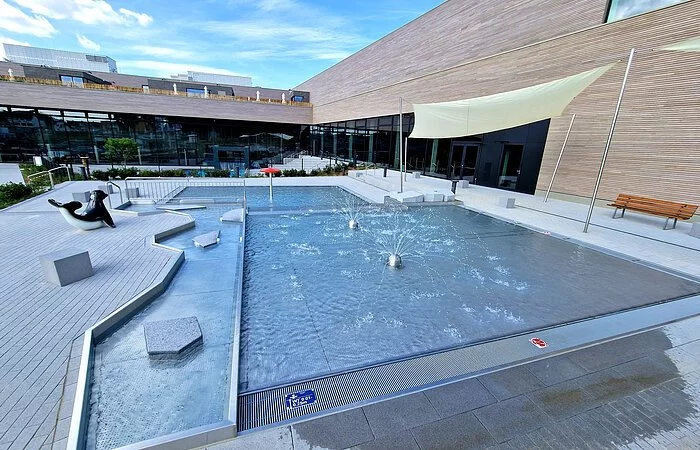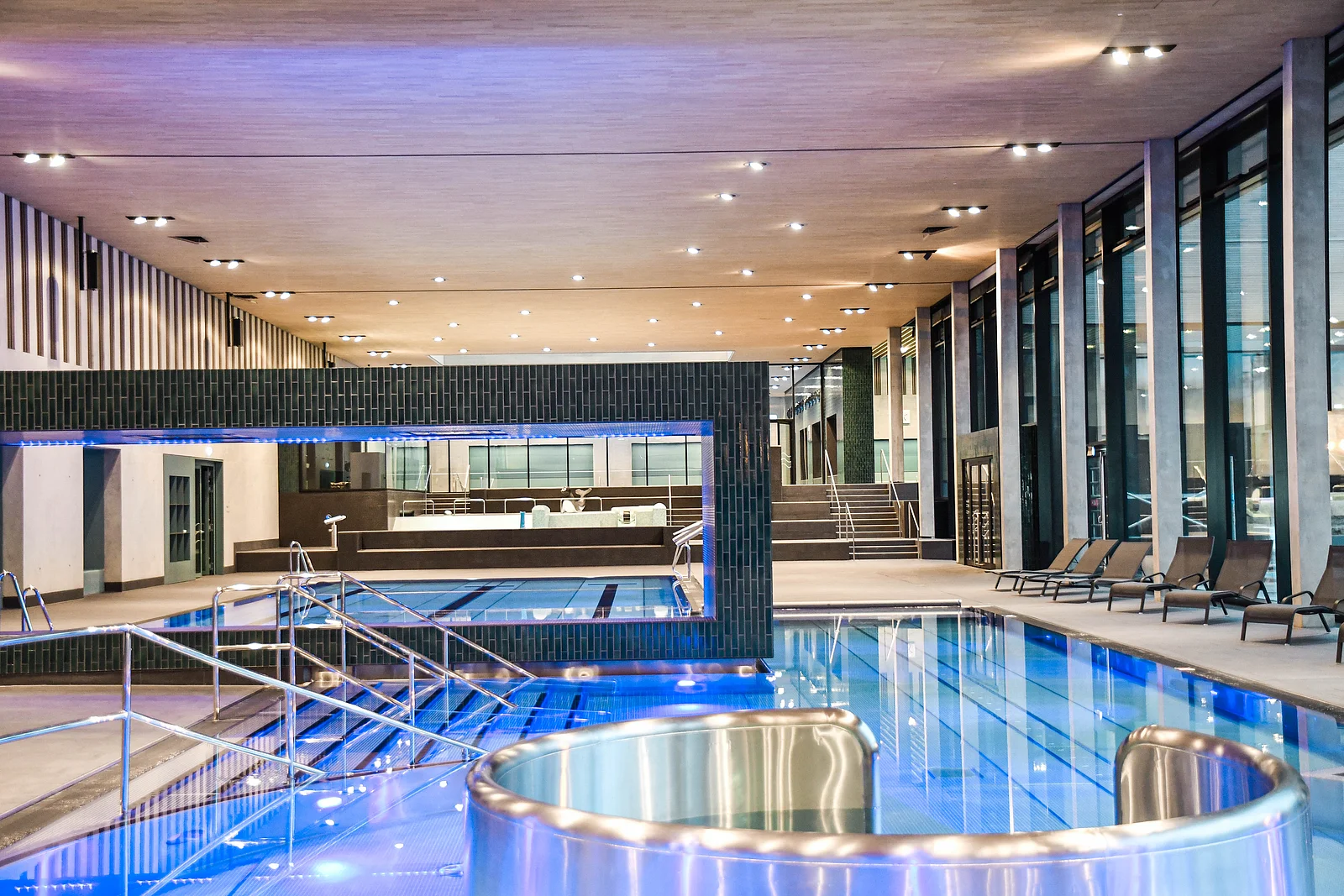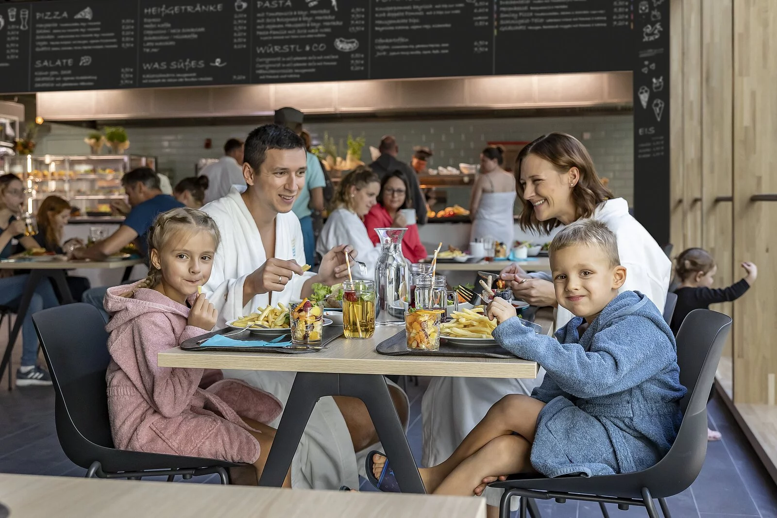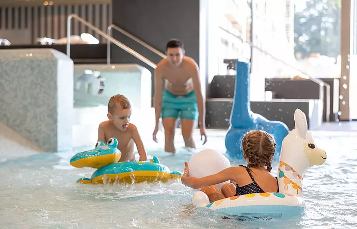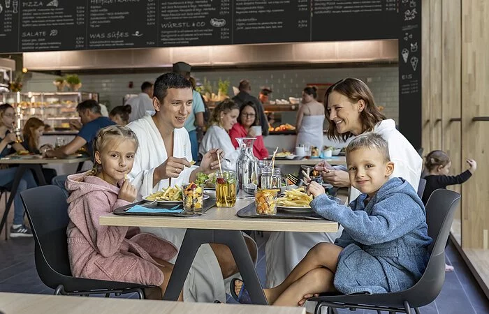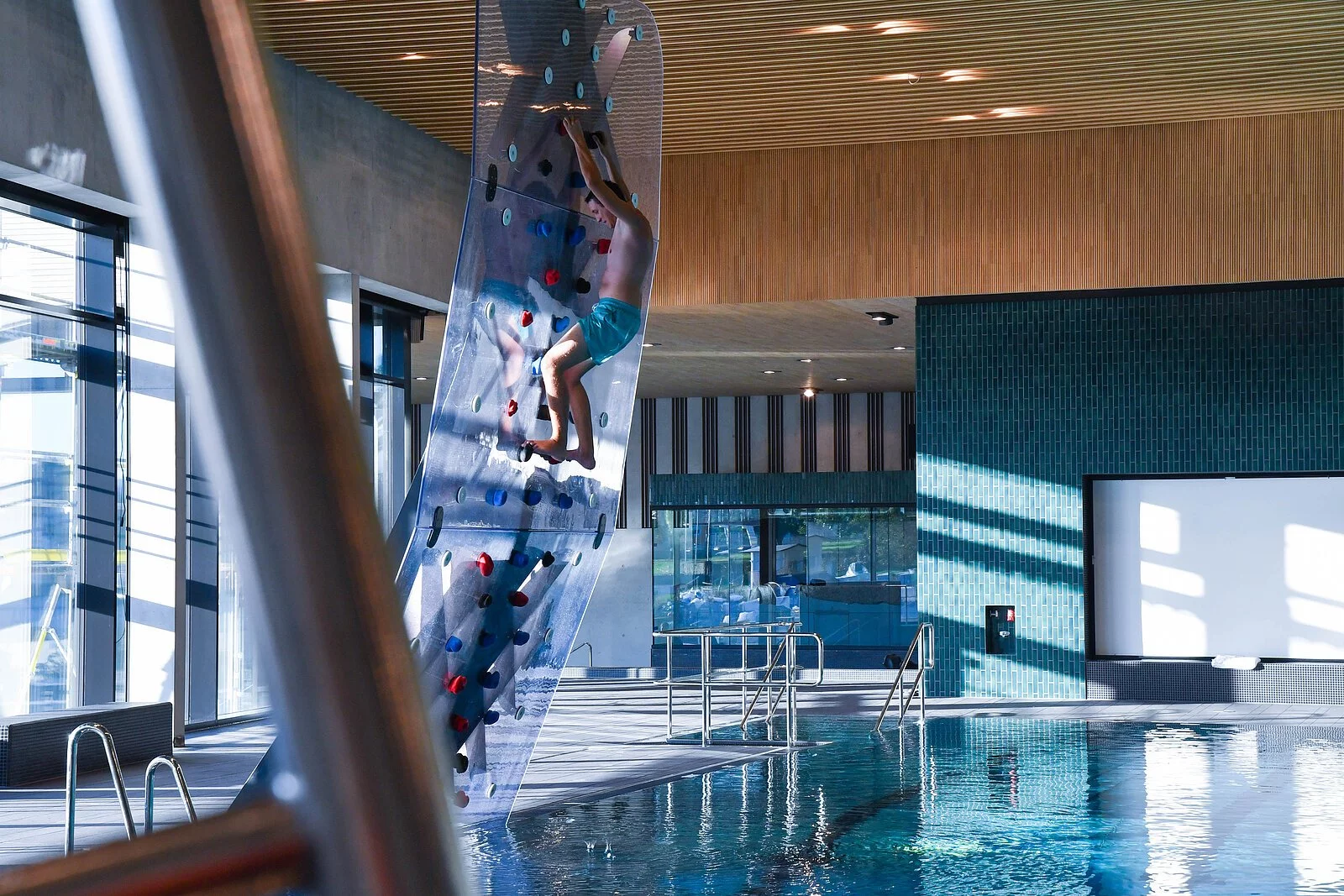 Großes Erlebnispotenzial bietet die Wasserwelt im Erdgeschoss der neuen Anlage. Mit dem wettkampftauglichen 25 Meter-Sportbecken einschließlich Sprunganlage und „Waterclimbing“, einem Erlebnisbecken mit Strömungskanal und Schaukelbucht, aber auch dem wohlig-warmen Sole-Außenbecken, werden viele Wünsche wahr. Fitness und Gesundheit stehen im Kursbecken mit Hubboden im Vordergrund. Und natürlich gibt es für die Kleinsten ein Kinderbecken mit Spritztieren, Spielbach und separatem Rutschenbereich: Spiel und Spaß sind somit garantiert. Das gemütliche Restaurant mit Kinderbereich bietet neben Pizza, Pasta und Pommes saisonale Köstlichkeiten aus der Region.