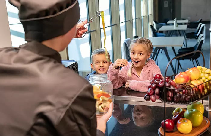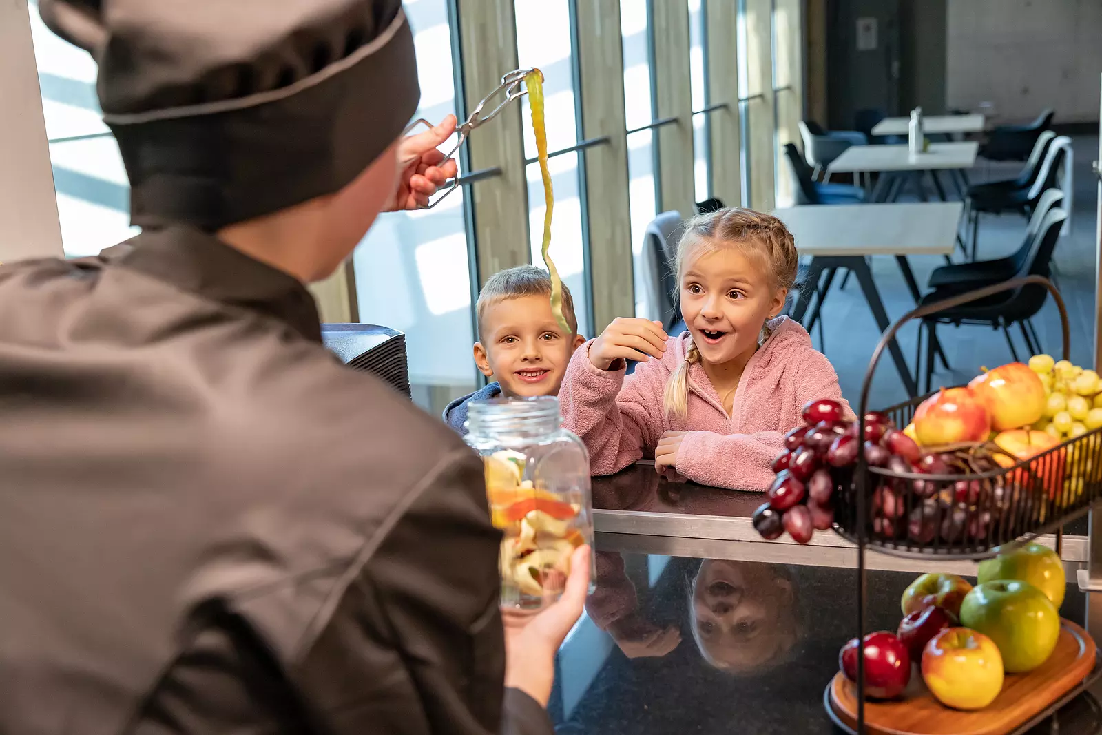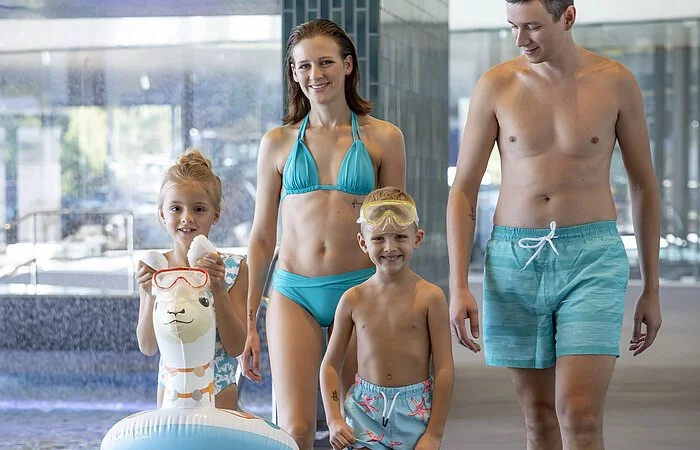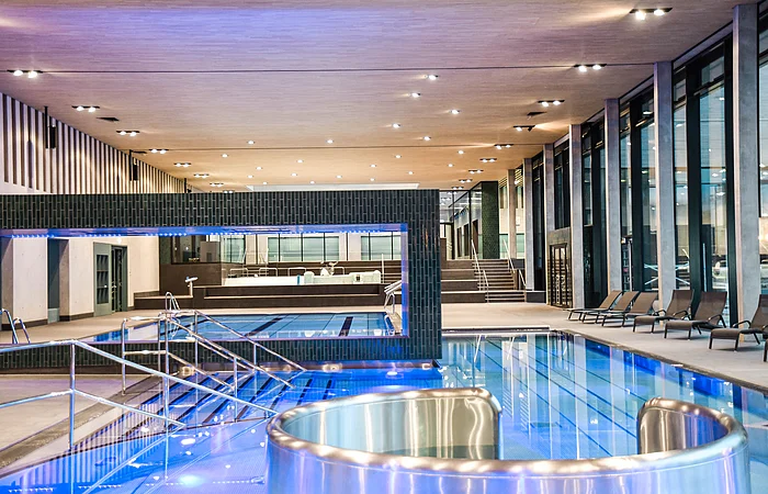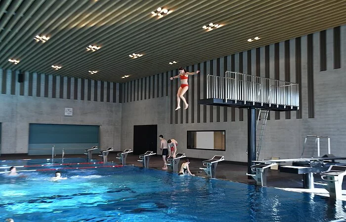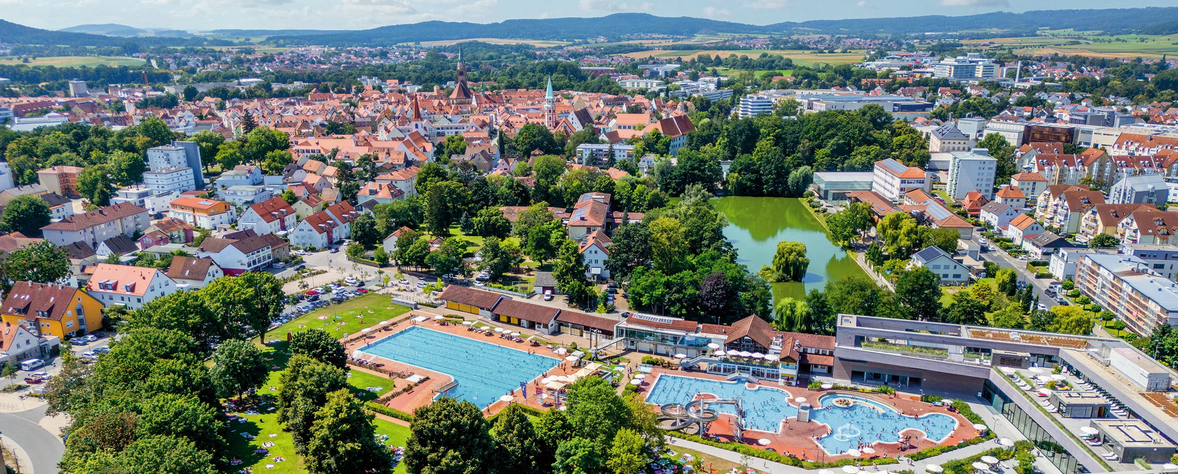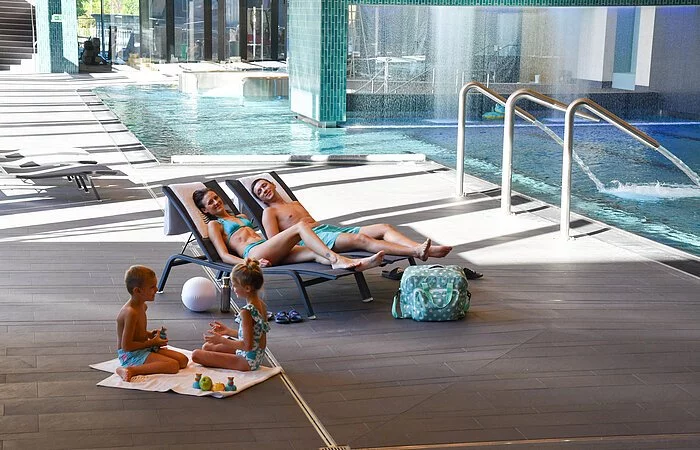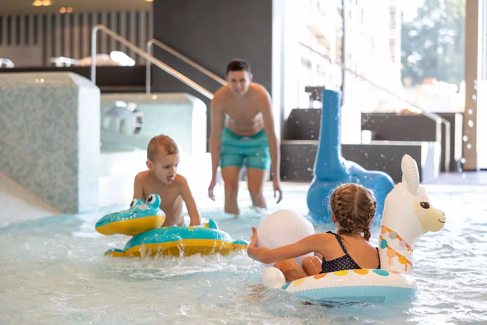 Großes Erlebnispotenzial bietet die Wasserwelt im Erdgeschoss der neuen Anlage. Mit dem wettkampftauglichen 25 Meter-Sportbecken einschließlich Sprunganlage und „Waterclimbing“, einem Erlebnisbecken mit Strömungskanal und Schaukelbucht, aber auch dem wohlig-warmen Sole-Außenbecken, werden viele Wünsche wahr. Fitness und Gesundheit stehen im Kursbecken mit Hubboden im Vordergrund. Und natürlich gibt es für die Kleinsten ein Kinderbecken mit Spritztieren, Spielbach und separatem Rutschenbereich: Spiel und Spaß sind somit garantiert. Das gemütliche Restaurant mit Kinderbereich bietet neben Pizza, Pasta und Pommes saisonale Köstlichkeiten aus der Region.