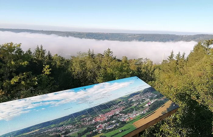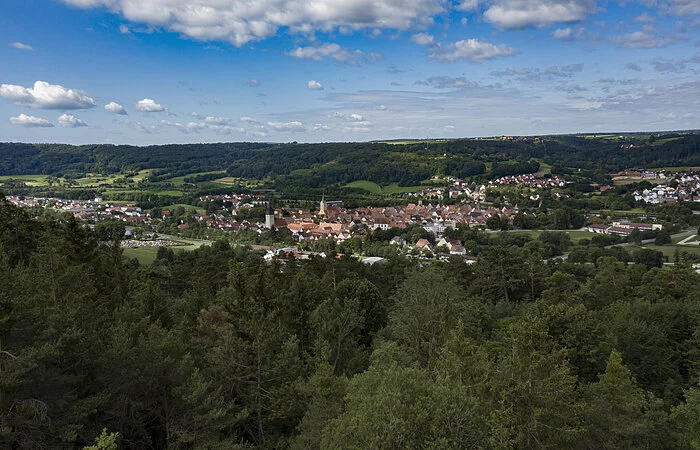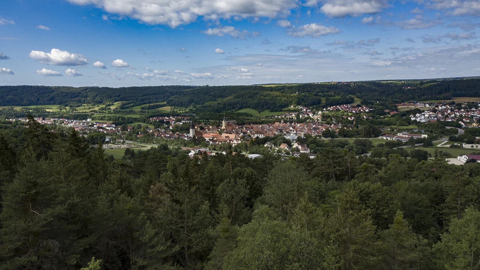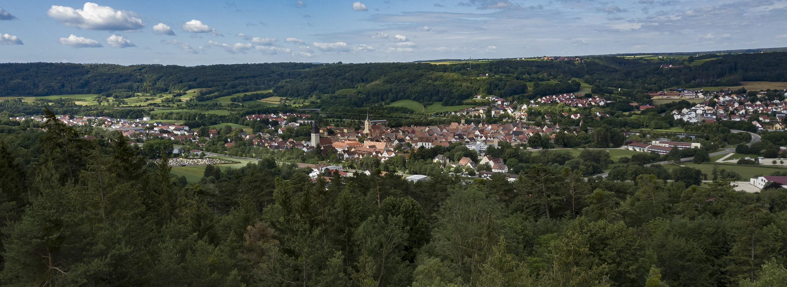 Wer entlang des Steinwegs geht, sollte fit und gut beschuht sein. Bergauf geht es erst durch das Rachental und danach noch etwas steiler einen kleinen Steig links hinauf. Nun folgt man dem Wirtschaftsweg hoch bis zum Wegkreuz, dann hält man sich links und gelangt nach ca. 500 Metern zur schönen Aussicht. Eine Bank und ein Tisch laden zu einer Rast ein. Mit dem dort installierten Fernrohr genießt man den Blick gen Westen über Berching und das schöne Sulztal. Ein romantischer Ort - vor allem wenn die Sonne untergeht und mit ihrem warmen Licht unser Städtchen in ein sanftes Rosa taucht.