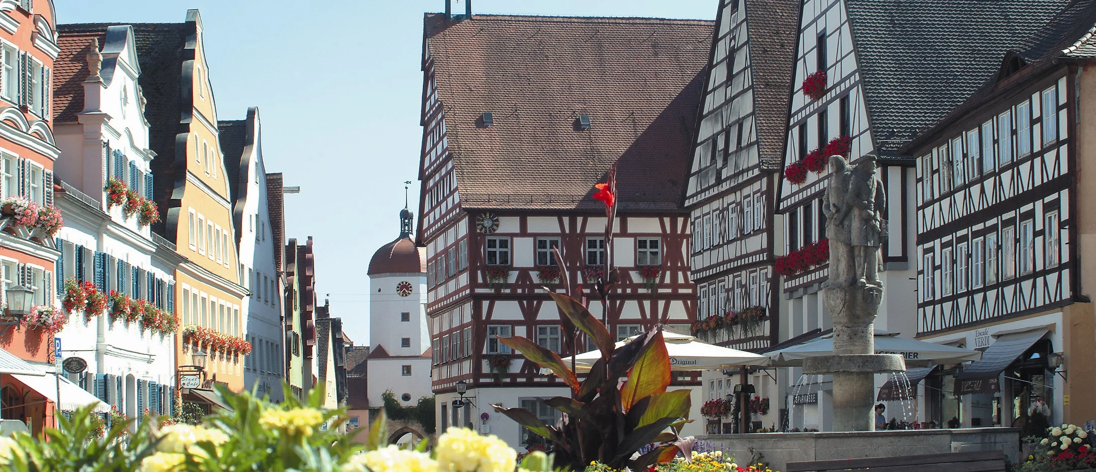 Neben dem fürstlichen Residenzschloss prägen die sich gegenüberstehenden Barock- und Fachwerkfassaden Oettingens bis heute eindrucksvoll das Stadtbild und erinnern an die einst konfessionelle Teilung unter den ehemaligen zwei Fürstenhäusern.