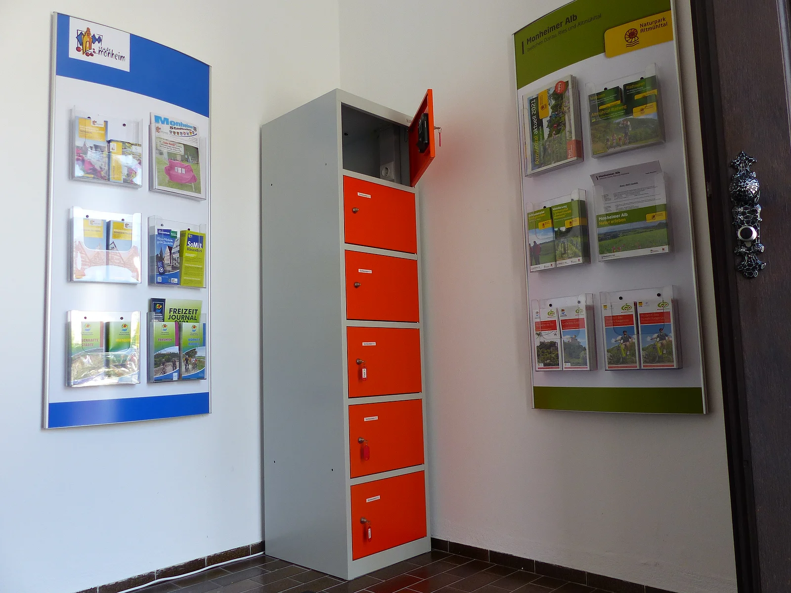 Im Vorraum der Tourist-Information befindet sich ein Indoor-Akku-Ladeschrank mit sechs Fächern für das kostenlose Aufladen von E-Bike-Akkus. Die Fächer sind gegen ein Pfand von 1,- € während der Ladezeit abschließbar.