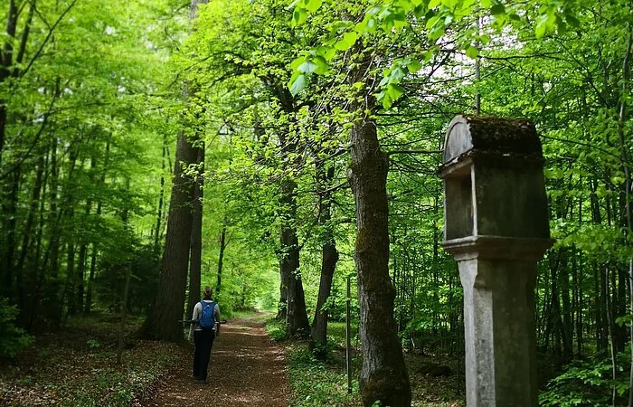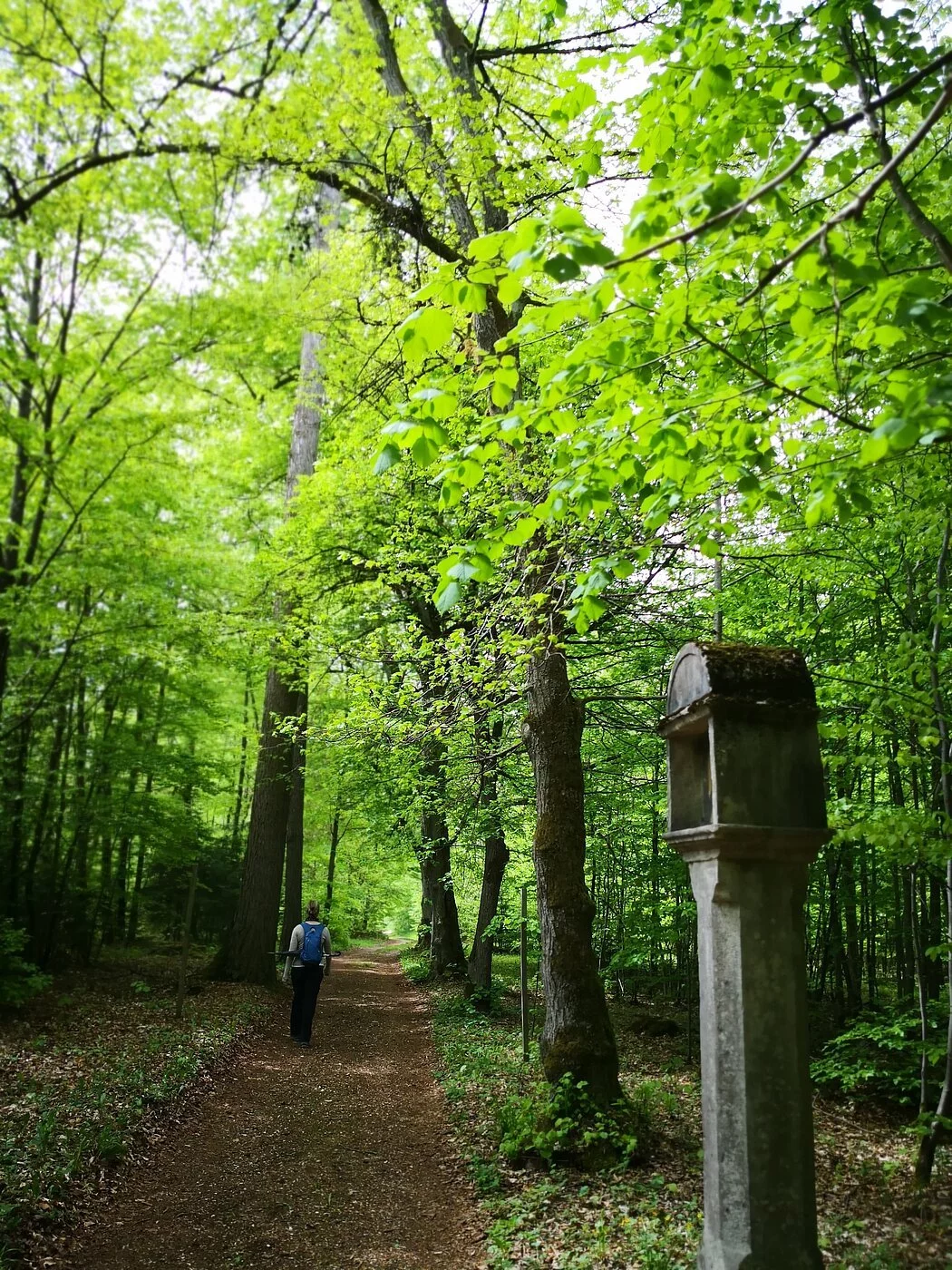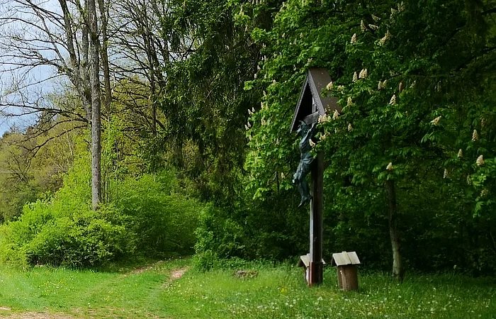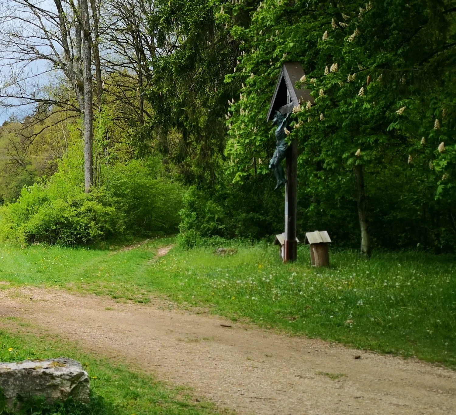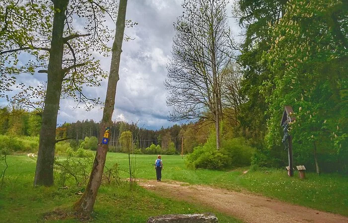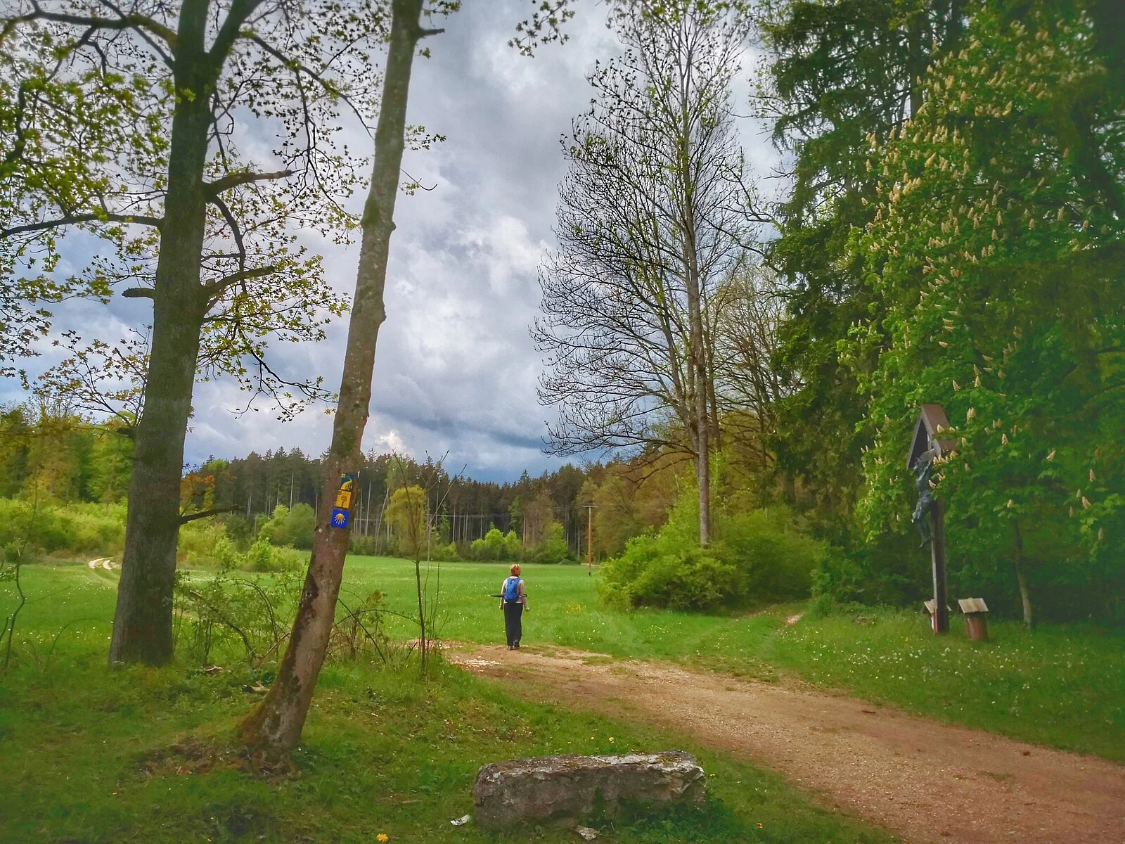 Geradeaus zu der Kreuzung am schwarzen Kreuz geht es auf die Traumschlaufe Nr. 14 am Altmühltal-Panoramaweg, den Jakobsweg von Nürnberg kommend, den Wallfahrerweg, den Ortsweg Nr. 5 zur Mammuthöhle, zu dem Drei Reiter Grab, zum historischen Kreuzweg (1591) von Buchenhüll, zu vielen Spazierwegen durch den Wald im Emondsholz und nicht zuletzt auf die Langlaufloipe von Buchenhüll, wenn es denn geschneit hat.