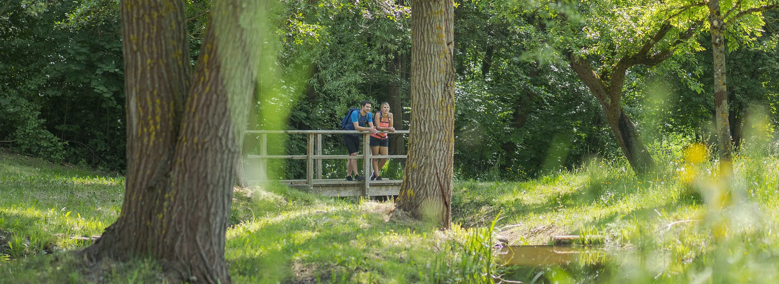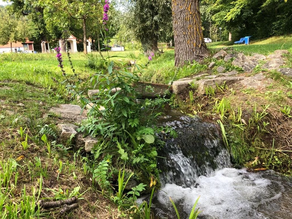 Der in den 90er Jahren angelegte Wasserspielplatz liegt direkt an einem kleinen Bachlauf. Die einfache Vorrichtung mindert den Spielspaß inmitten der Blumenwiese nicht.