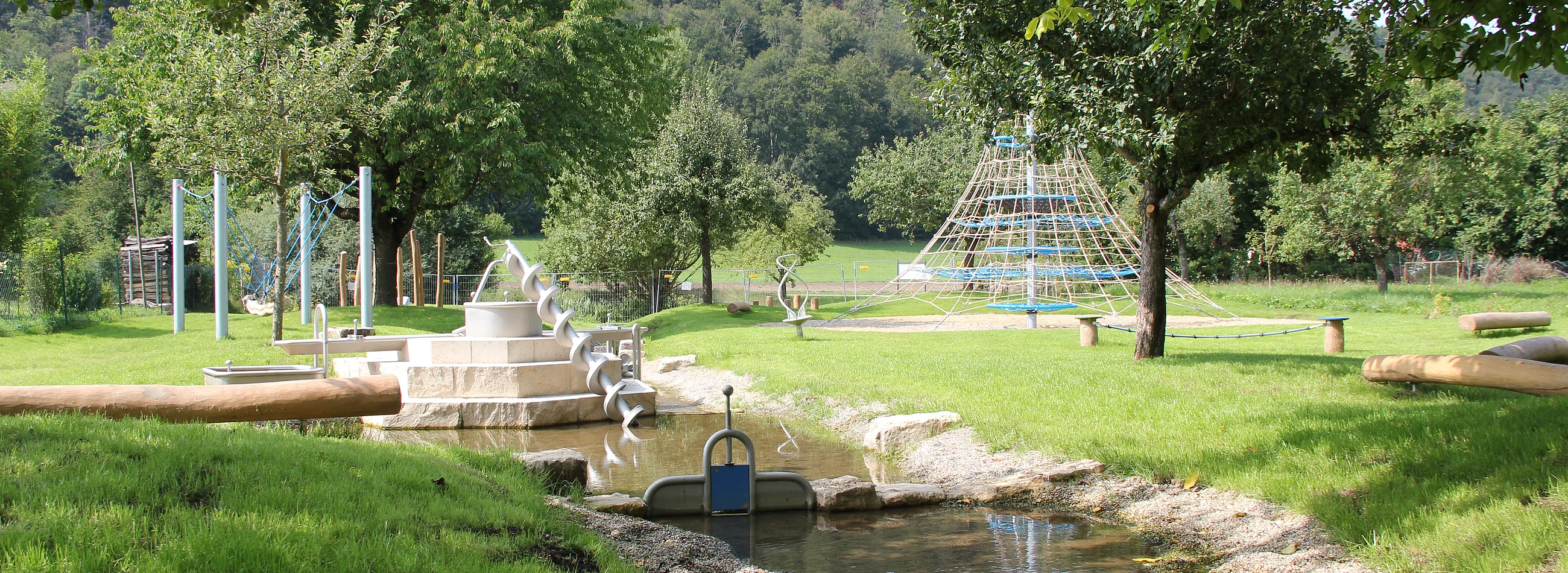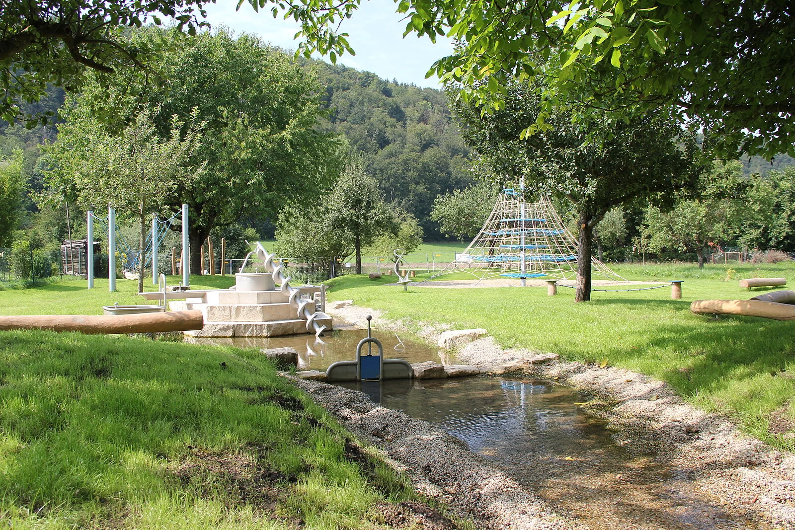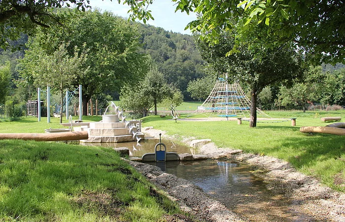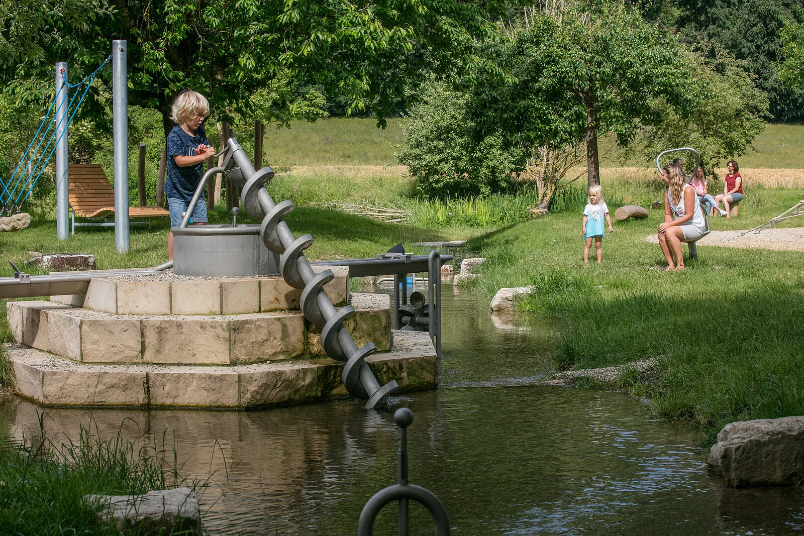 In Enkering ist ein Ort entstanden, an dem Kinder und Erwachsene über den gesamten Jahreslauf hinweg spielen können. Im Umfeld der vielen Gewässer und Quellen in Enkering wurde das Thema „Wasser“ zum Schwerpunkt des Spielbereiches. Der Mühlbach und die Sollache sind nun über einen neu geschaffenen, mäandrierenden Bachlauf miteinander verbunden, in dem die Kinder und Erwachsenen das Wasser im Jahreslauf in seinen verschiedenen Ausprägungen erleben können. Eingebaute Stauwehre, eine archimedische Schraube mit weiteren Gestaltungselementen sowie die mit Kies gestalteten Uferbereiche geben viele Anregungen, das Element „Wasser“ spielerisch zu entdecken und zu erfahren. Dabei soll auch das Bewusstsein für den wertvollen Rohstoff Wasser und die Umwelt gestärkt werden. Wie Treibholz liegen Langhölzer in dem in Wellen geformten Gelände, die zum Balancieren aber auch zum Verweilen einladen. Mit weiteren Elementen zum Klettern, Springen, Schaukeln und Balancieren können Kinder und Erwachsene ihre Sinne erproben, sich spielend bewegen, Abenteuer erleben. Die bereits vorhandenen alten Obstbäume sind ebenfalls in den verschiedenen Ausprägungen der Jahreszeiten zu erleben. So spenden sie an heißen Tagen wie in diesem Sommer kühlen Schatten. Bewusst hat das an der Gestaltung beteiligte Team auf eine Rutsche und andere Spielelemente verzichtet, da diese an weiteren Spielplätzen in der Umgebung zu finden sind. Sitzbänke laden zum Verweilen ein. Durch die Verbindung der beiden Gewässer geht es für alle Generationen „Von Bach zu Bach“ und „über Berg und Tal“ des hügelig geformten Geländes, das ab sofort zum Entdecken bereit ist.