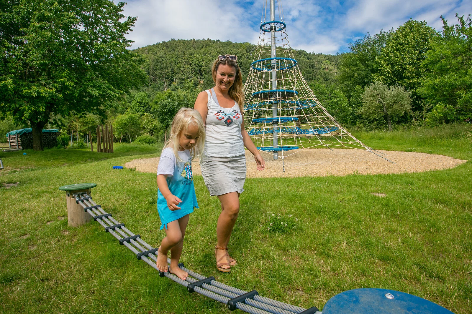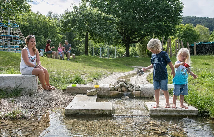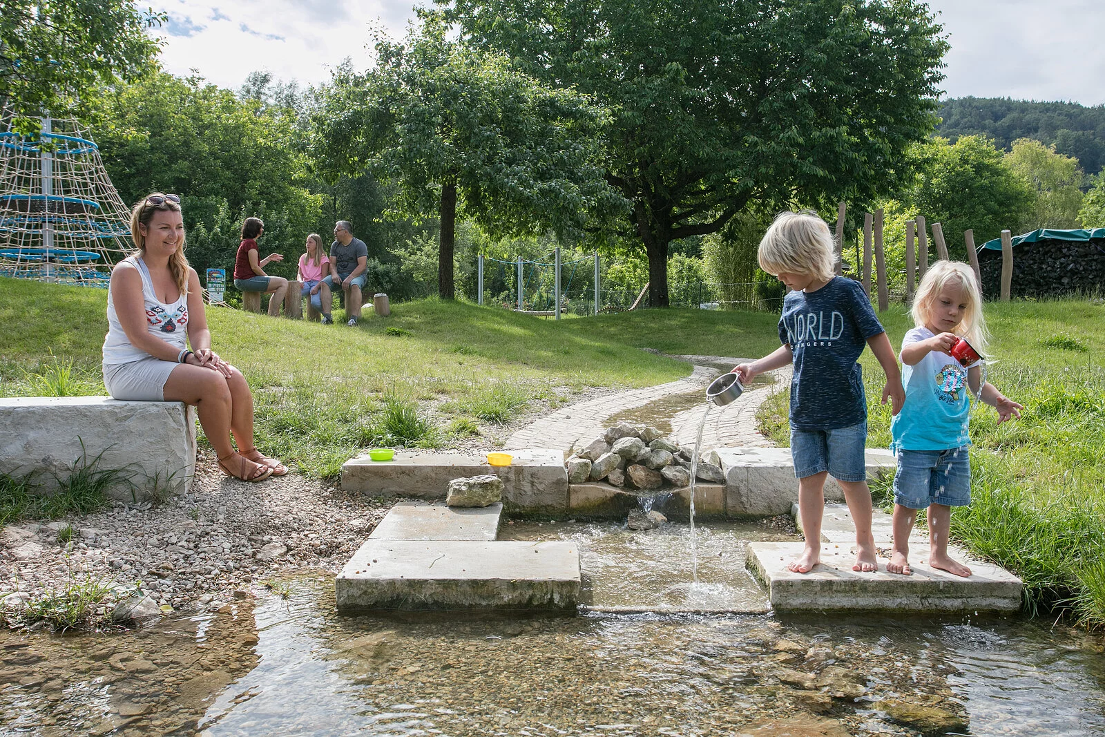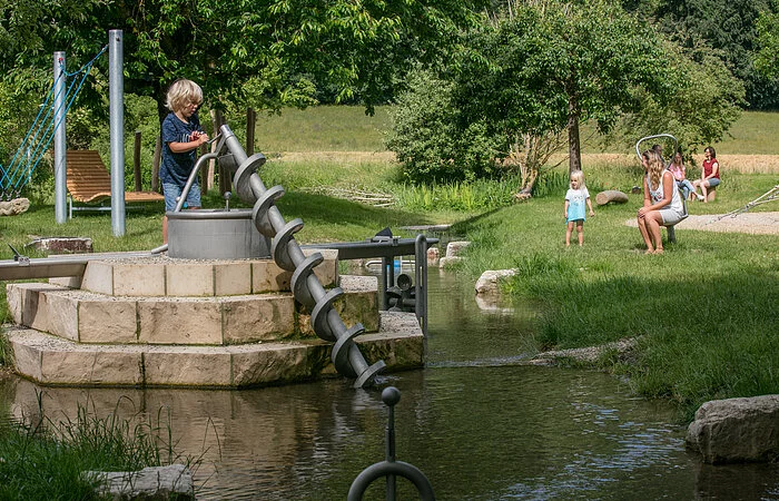In Enkering ist ein Ort entstanden, an dem Kinder und Erwachsene über den gesamten Jahreslauf hinweg spielen können. Im Umfeld der vielen Gewässer und Quellen in Enkering wurde das Thema „Wasser“ zum Schwerpunkt des Spielbereiches. Der Mühlbach und die Sollache sind nun über einen neu geschaffenen, mäandrierenden Bachlauf miteinander verbunden, in dem die Kinder und Erwachsenen das Wasser im Jahreslauf in seinen verschiedenen Ausprägungen erleben können. Eingebaute Stauwehre, eine archimedische Schraube mit weiteren Gestaltungselementen sowie die mit Kies gestalteten Uferbereiche geben viele Anregungen, das Element „Wasser“ spielerisch zu entdecken und zu erfahren. Dabei soll auch das Bewusstsein für den wertvollen Rohstoff Wasser und die Umwelt gestärkt werden. Wie Treibholz liegen Langhölzer in dem in Wellen geformten Gelände, die zum Balancieren aber auch zum Verweilen einladen. Mit weiteren Elementen zum Klettern, Springen, Schaukeln und Balancieren können Kinder und Erwachsene ihre Sinne erproben, sich spielend bewegen, Abenteuer erleben. Die bereits vorhandenen alten Obstbäume sind ebenfalls in den verschiedenen Ausprägungen der Jahreszeiten zu erleben. So spenden sie an heißen Tagen wie in diesem Sommer kühlen Schatten. Bewusst hat das an der Gestaltung beteiligte Team auf eine Rutsche und andere Spielelemente verzichtet, da diese an weiteren Spielplätzen in der Umgebung zu finden sind. Sitzbänke laden zum Verweilen ein. Durch die Verbindung der beiden Gewässer geht es für alle Generationen „Von Bach zu Bach“ und „über Berg und Tal“ des hügelig geformten Geländes, das ab sofort zum Entdecken bereit ist.
