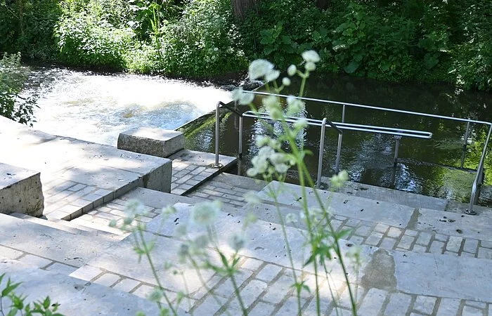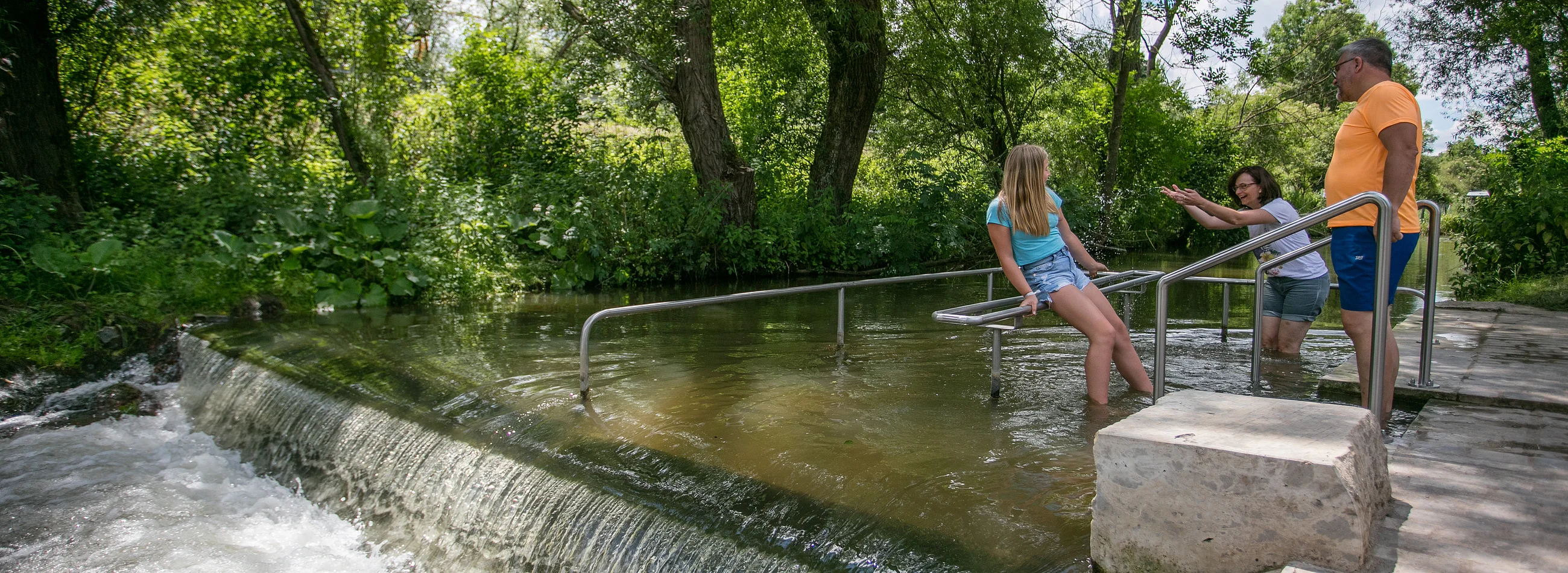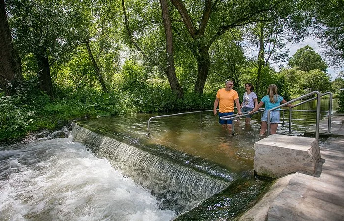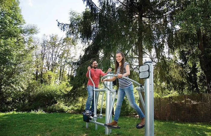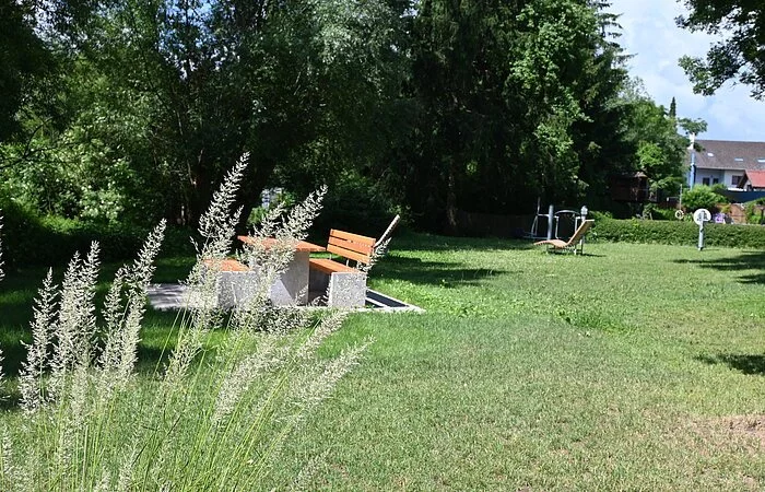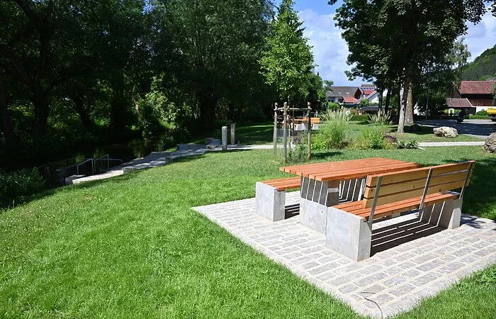 Die Wassertretanlage in Kinding - eine wohltuende Erfrischung für die Beine nach einer Wanderung, Radltour oder Nutzung unserer Fitnessgeräte. Sitzgruppen und Waldsofas laden unter Schatten spendenden Bäumen zum gemütlichen Verweilen ein.