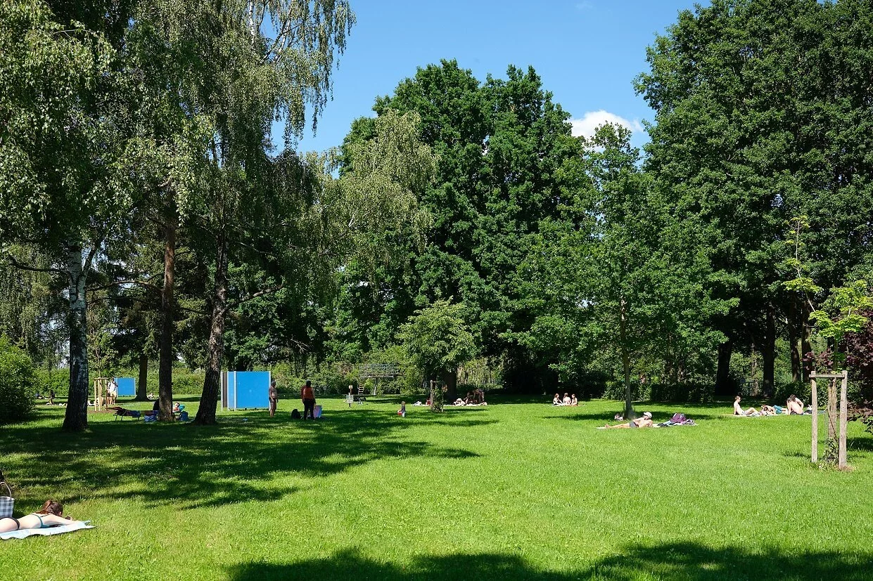 weite Liegewiesen zum Sonnen, Plätze für Boule, Indiaca, Beachvolleyball, Tischtennis oder Minigolf. Mit Bootsverleih und SUP-Board-Verleih. Für die Kinder gibt es Spielplätze, ein Planschbecken und eine Matschanlage. Ein Kiosk mit Biergarten bietet Erfrischungen, Imbisse und Kuchen an.