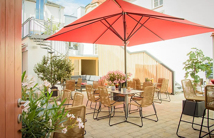 In unserem neu gestalteten Innenhof finden Sie einen mediterranen Rückzugsort mit besonderer Atmosphäre – ideal, um an Sommerabenden bei einem Glas Bier oder einem Cocktail die Seele baumeln zu lassen und sich mit Freunden zu treffen.