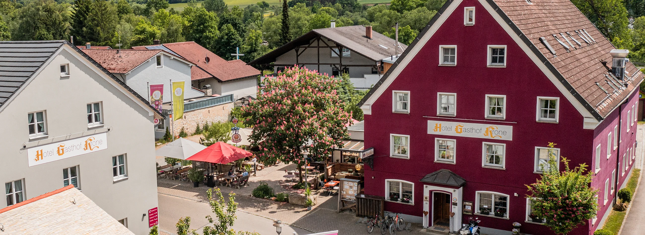 Modern gestalteter Teil der Gaststube in der Krone in Kinding. Verwendung von Holz vereint Tradition und Moderne zum Beispiel durch helle, naturbelassene Holzwände, einer Holzdecke, eine Schiebetüre im Scheunenstil sowie helle Sitzmöglichkeiten mit Sitzkissen in gedeckten Farben.Das Bild zeigt einen Braten, welcher mit viel Hingebung angerichtet wurde. Drappiert ist der Braten auf einem Bett aus grünen Bohnen mit frischen Petersilien-Kartoffeln. Oben auf ein Semmelknödel garniert mit einem Rosmarin-Zweig und schöner BratensoßeTraditionell bayerische Gaststube der Krone in Kinding. Eingerichtet mit einem typisch bayerischen gemauerten Kamin und Sitzmöglichkeiten drum herum sowie viele Holzelemente (Holzdecke, Teilvertäfelung an den Wänden, Holzstühle).Traditionelles Schweineschäuferl, angerichtet auf einem weißen Teller mit viel Soße, zwei Kartoffelknödel und einem scharfen Messer, welches traditionell senkrecht in das Schäuferl gesteckt wirdEin liebevoll und grün gestalteter Biergarten mit Holz-Biertischen, großen weißen Sonnenschirmen sowie einem massiven Holzunterstand, der mit alten Küchenutensilien und Lichterketten dekoriert istAuf einem Holz-Biertisch steht ein frisch gezapftes Glas helles Bier, ein Brotkorb mit bayerischer Serviette und frischem Brot drin sowie eine liebevoll und typisch bayerische Brotzeitplatte mit frischer Wurst, garniert mit Zwiebeln, Essiggurken und Ei