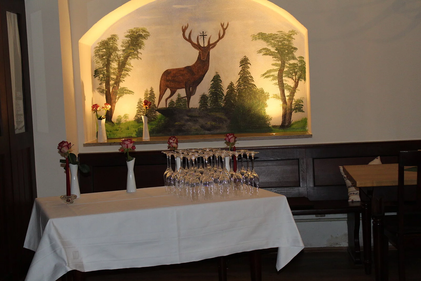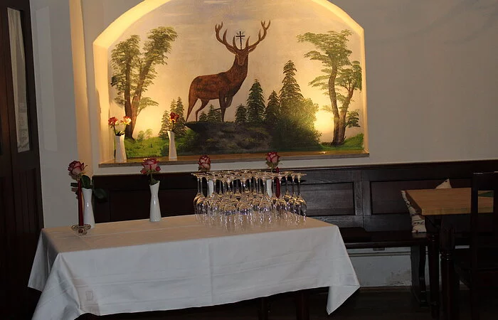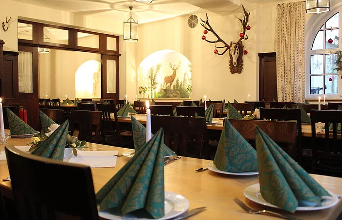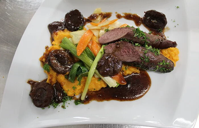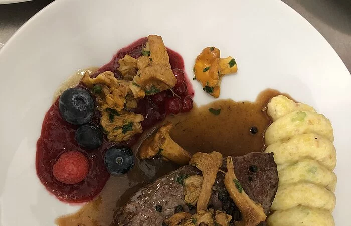 Wir bieten regelmäßig Wildgerichte von Hase, Fasan bis Wisent an, sowie Hirsch, Reh und Wildschwein.