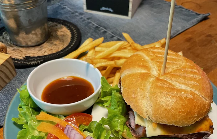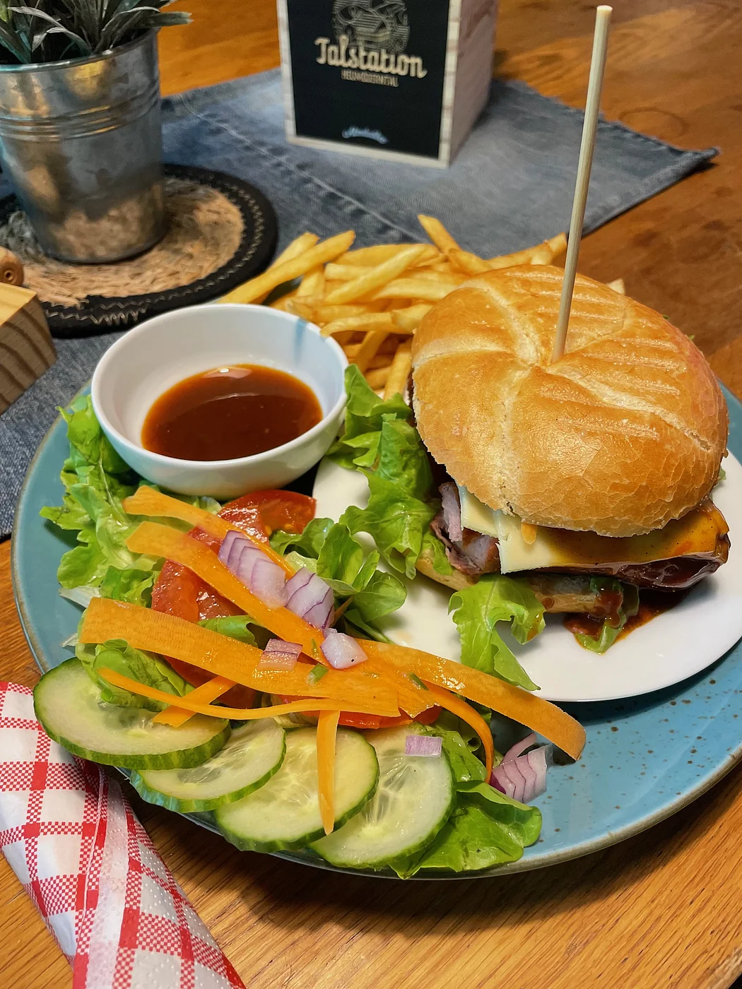Genieße Burger-, herzhafte- und vegane Gerichte auf unserer Sonnenterrasse oder in unserer gemütlichen Stube. Genieße regionale Biere, kalte Getränke und lecker Kaffee-Spezialitäten. Für den Hunger gibt es Snacks, Salate sowie unsere Klassiker Bratwurst mit Kraut oder Currywurst. Als Nachspeise verschiedene Kuchen aus Treuchtlingen.