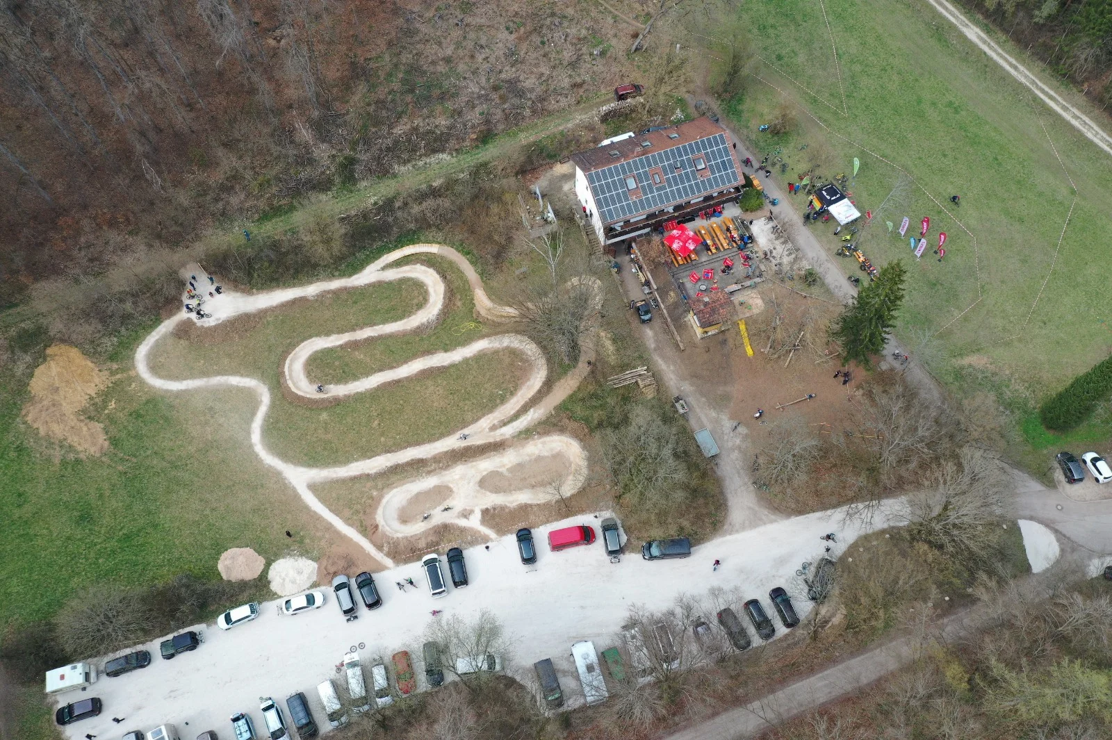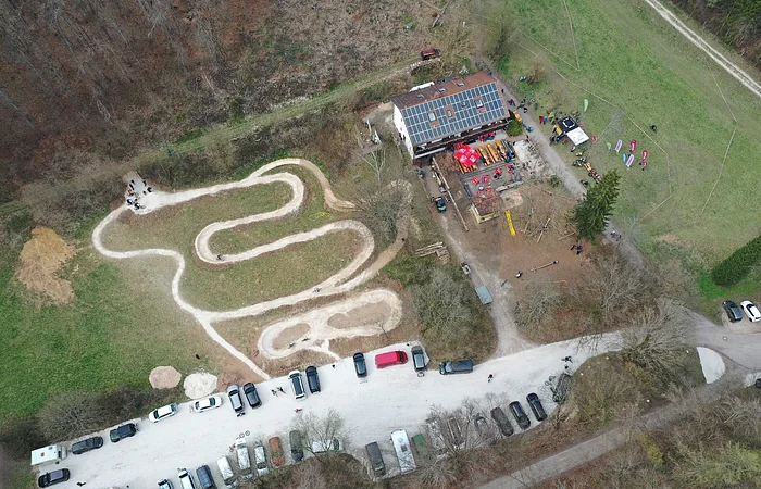 Angrenzend an die Sonnenterrasse gibt es einen Sandkasten mit Rutsche für die ganz Kleinen und ein Kletterspielplatz am Hang. Mit dem Blick nach rechts erblickst du den Übungsparcours & Pumptrack der HeumödernTrails und das Wildgehege.