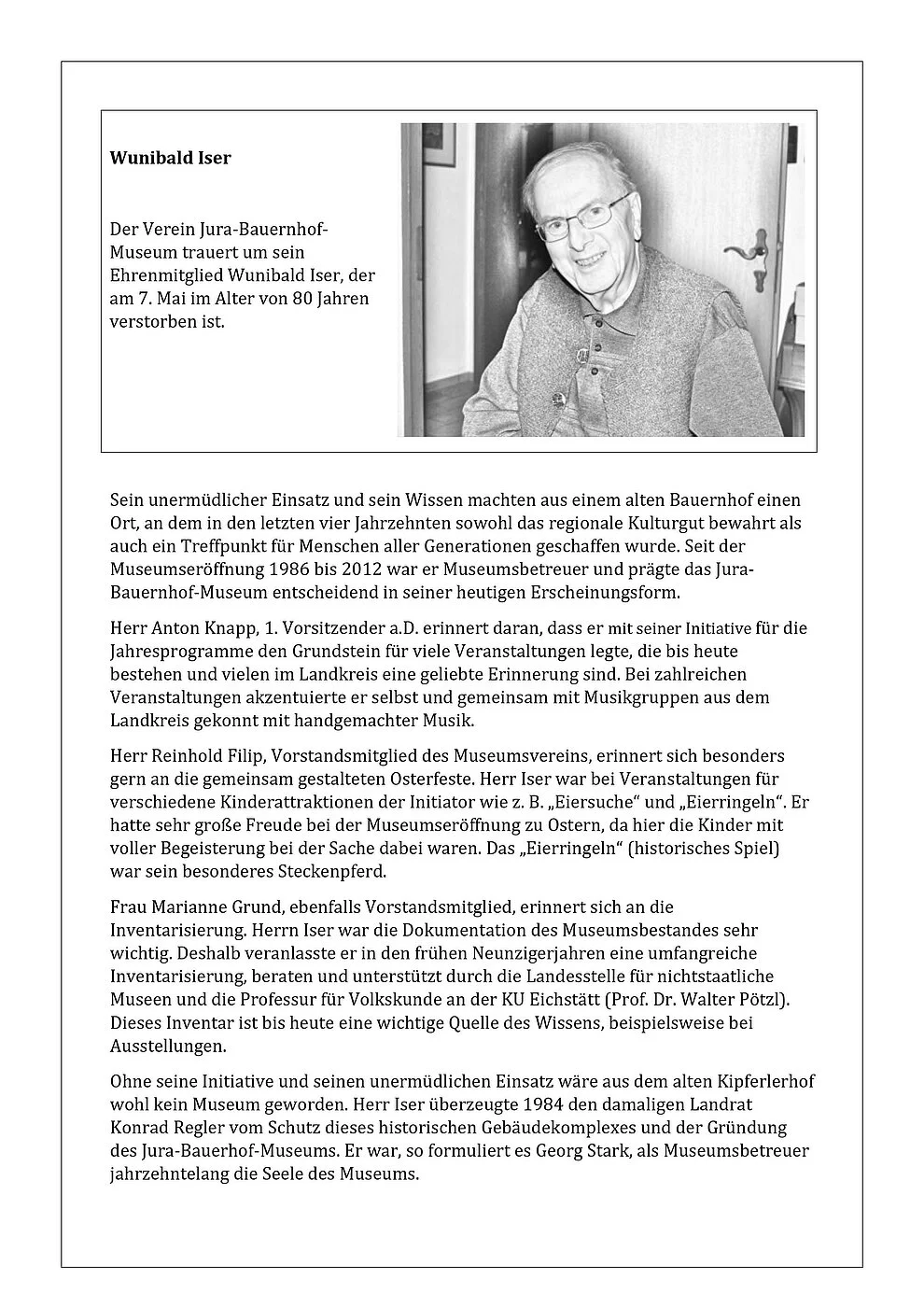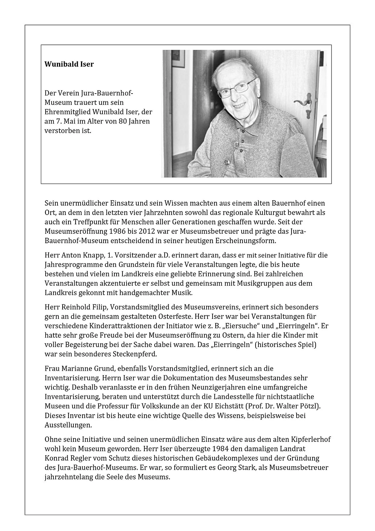 Der Verein Jura-Bauernhof-Museum trauert um sein Ehrenmitglied Wunibald Iser, der am 7. Mai 2021 im Alter von 80 Jahren verstorben ist.
