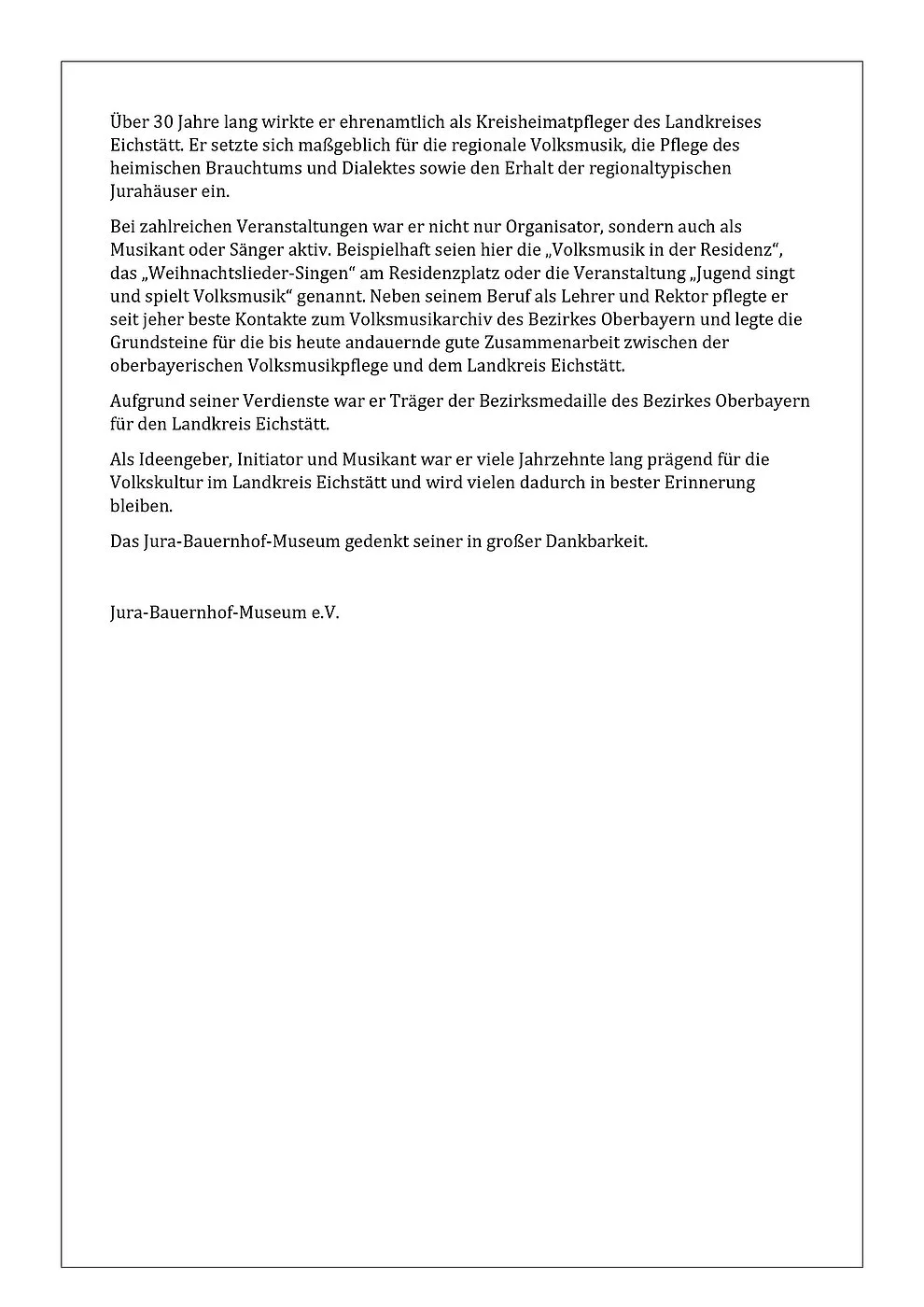 Als Ideengeber, Initiator und Musikant war er viele Jahrzehnte lang prägend für die Volkskultur im Landkreis Eichstätt und wird vielen dadurch in bester Erinnerung bleiben.